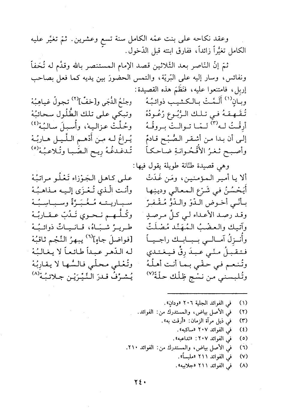 ثمّ إنّ النّاصر بعد الثّلاثين قصد الإِمَام المستنصر باللَّه وقدّم له تُحَفًا ونفائس، وسار إليه على البرّيّة، والتمس الحضورَ بين يديه كما فعل بصاحب إربِل، فامتنعوا عليه، فنَظَمَ هذه القصيدة: