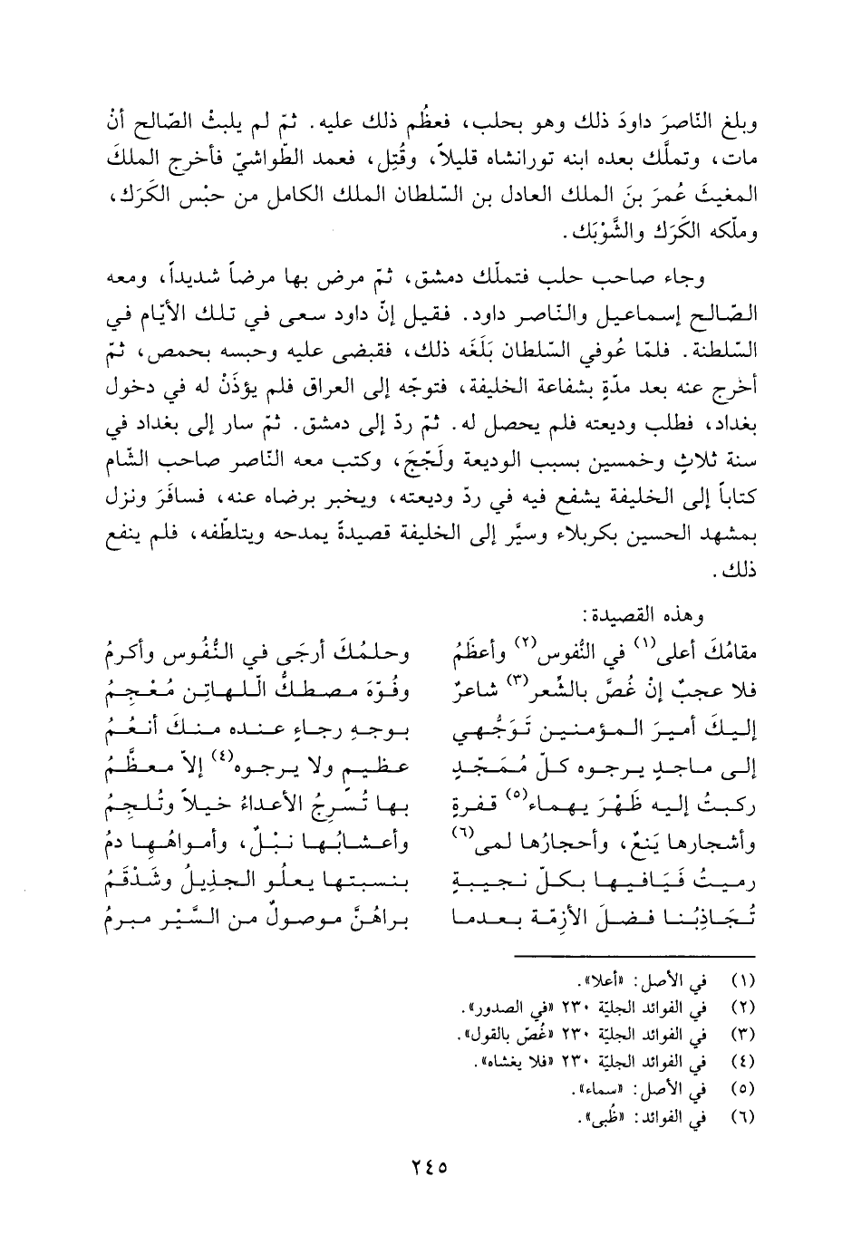 وجاء صاحب حلب فتملّك دمشق، ثمّ مرض بها مرضا شديدا، ومعه الصّالح إِسْمَاعِيل والنّاصر دَاوُد. فقيل إنّ دَاوُد سعى فِي تلك الأيّام فِي السّلطنة. فلمّا عُوفي السُّلطان بَلَغَه ذلك، فقبض عليه وحبسه بحمص، ثمّ أخرج عَنْهُ بعد مدةٍ بشفاعة الخليفة، فتوجّه إلى العراق فلم يؤذَنْ له فِي دخول بغداد، فطلب وديعته فلم يحصل له. ثمّ ردّ إلى دمشق. ثمّ سار إلى بغداد فِي سنة ثلاثٍ وخمسين بسبب الوديعة ولَججَ، وكتب معه النّاصر صاحب الشّام كتابا إلى الخليفة يشفع فِيهِ فِي ردّ وديعته، ويخبر برضاه عَنْهُ، فسافَرَ ونزل بمشهد الْحُسَيْن بكربلاء وسيّر إلى الخليفة قصيدة يمدحه ويتلطّفه، فلم ينفع ذلك.