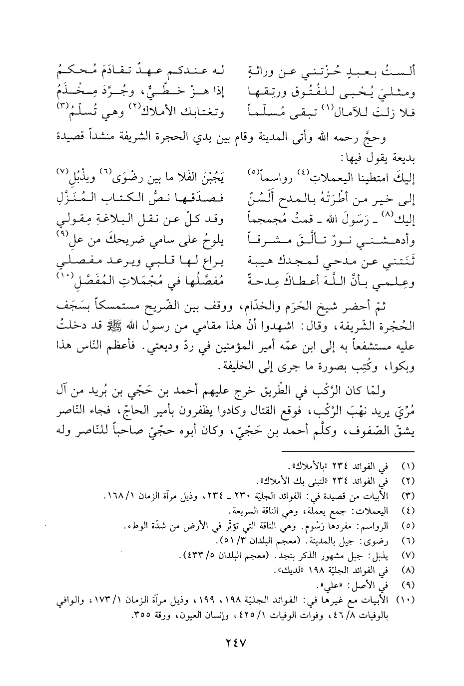 [10] الأبيات مع غيرها في: الفوائد الجليّة 198، 199، وذيل مرآة الزمان 1/ 173، والوافي بالوفيات 8/ 46، وفوات الوفيات 1/ 425، وإنسان العيون، ورقة 355.