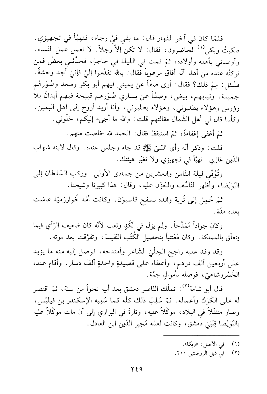 قلت: وذكر أَنَّهُ رَأَى النّبيّ صلّى الله عليه وآله وَسَلَّمَ قد جاء وجلس عنده. وقال لابنه شهاب الدّين غازي: تهيّأ فِي تجهيزي ولا تغيّر هيئتك.