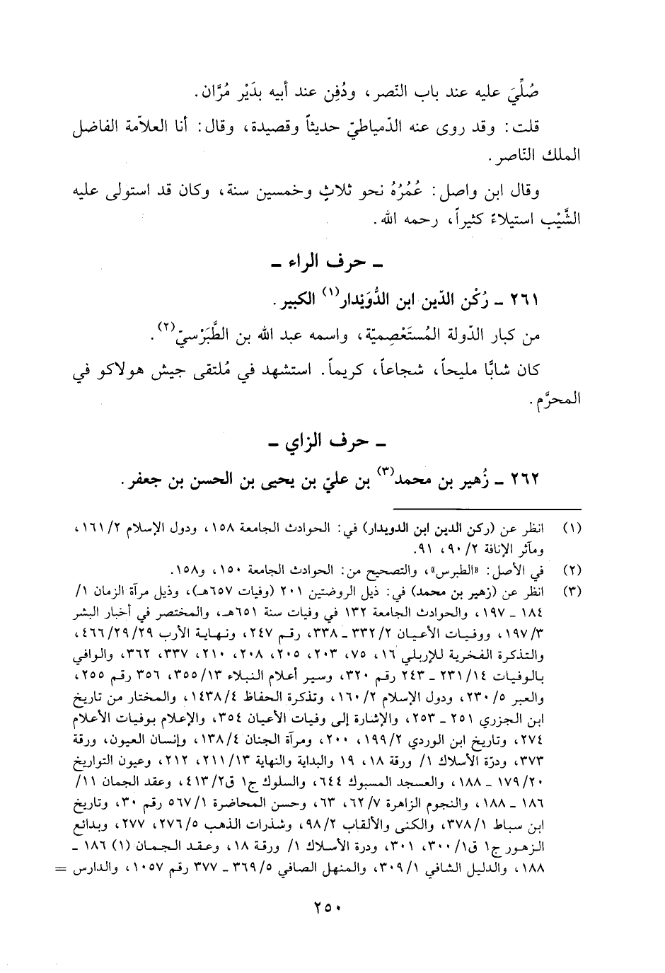 [3] انظر عن (زهير بن محمد) في: ذيل الروضتين 201 (وفيات 657 هـ) ، وذيل مرآة الزمان 1/ 184- 197، والحوادث الجامعة 132 في وفيات سنة 651 هـ، والمختصر في أخبار البشر 3/ 197، ووفيات الأعيان 2/ 332- 338، رقم 247، ونهاية الأرب 29/ 29/ 466، والتذكرة الفخرية للإربلي 16، 75، 203، 205، 208، 210، 337، 362، والوافي بالوفيات 14/ 231- 243 رقم 320، وسير أعلام النبلاء 13/ 355، 356 رقم 255، والعبر 5/ 230، ودول الإسلام 2/ 160، وتذكرة الحفاظ 4/ 1438، والمختار من تاريخ ابن الجزري 251- 253، والإشارة إلى وفيات الأعيان 354، والإعلام بوفيات الأعلام 274، وتاريخ ابن الوردي 2/ 199، 200، ومرآة الجنان 4/ 138، وإنسان العيون، ورقة 373، ودرّة الأسلاك 1/ ورقة 18، 19 والبداية والنهاية 13/ 211، 212، وعيون التواريخ 20/ 179- 188، والعسجد المسبوك 644، والسلوك ج 1 ق 2/ 413، وعقد الجمان 11/ 186- 188، والنجوم الزاهرة 7/ 62، 63، وحسن المحاضرة 1/ 567 رقم 30، وتاريخ ابن سباط 1/ 378، والكنى والألقاب 2/ 98، وشذرات الذهب 5/ 276، 277، وبدائع الزهور ج 1 ق 1/ 300، 301، ودرة الأسلاك 1/ ورقة 18، وعقد الجمان (1) 186- 188، والدليل الشافي 1/ 309، والمنهل الصافي 5/ 369- 377 رقم 1057، والدارس