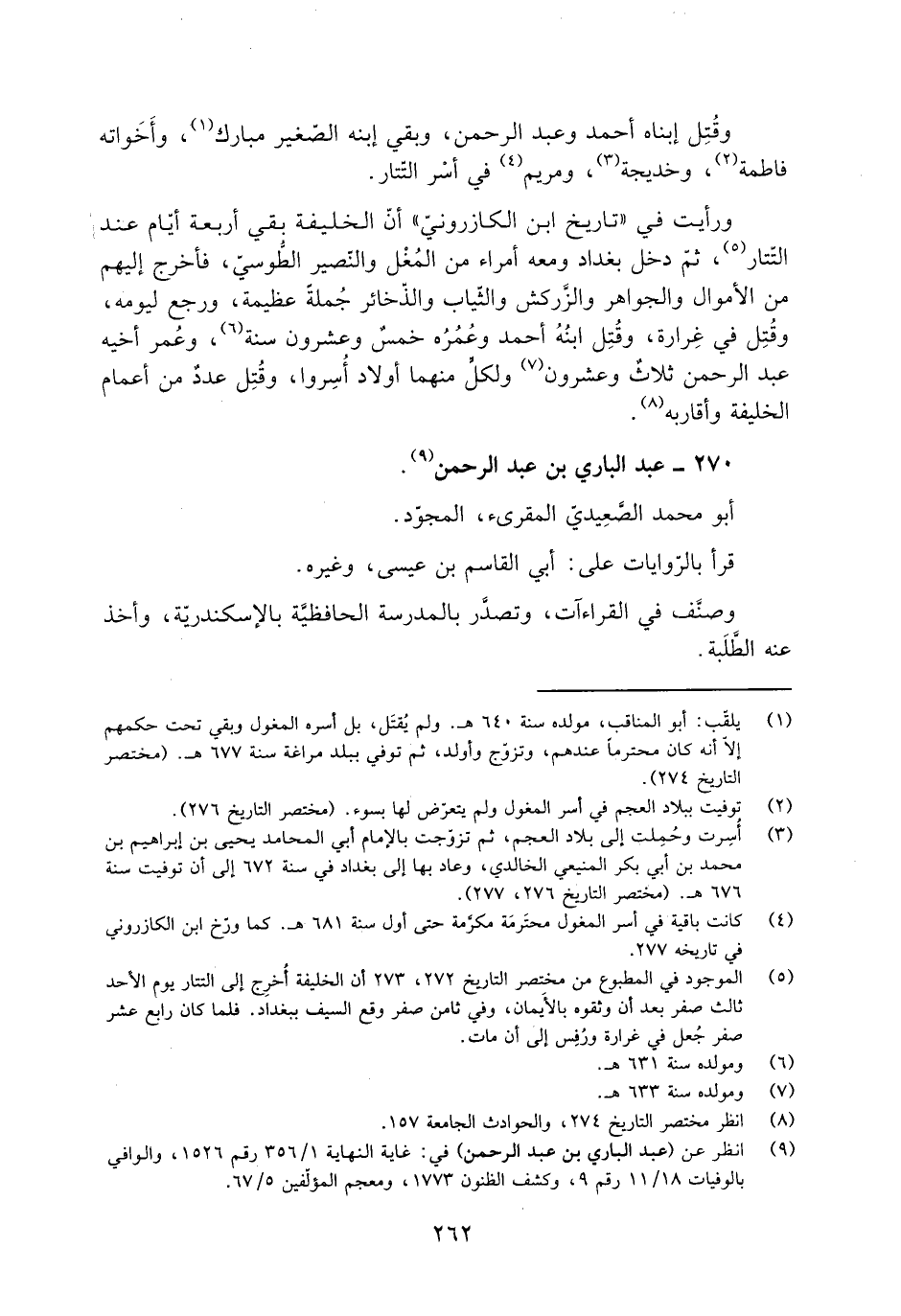 ورأيت فِي «تاريخ ابن الكازرونيّ» أنّ الخليفة بقي أربعة أيّام عند التّتار [5] ، ثُمَّ دخل بغداد ومعه أمراء مِن المُغْل والنّصير الطّوسيّ، فأخرج إليهم مِن الأموال والجواهر والزّركش والثّياب والذّخائر جملة عظيمة، ورجع ليومه، وقُتِل فِي غِرارة، وقُتِل ابنُهُ أحمد وعُمُرُه خمسٌ وعشرون سنة [6] ، وعُمر أخيه عَبْد الرَّحْمَن ثلاث وعشرون [7] ولكلّ منهما أولاد أسِروا، وقُتِل عددٌ مِنْ أعمام الخليفة وأقاربه [8] .