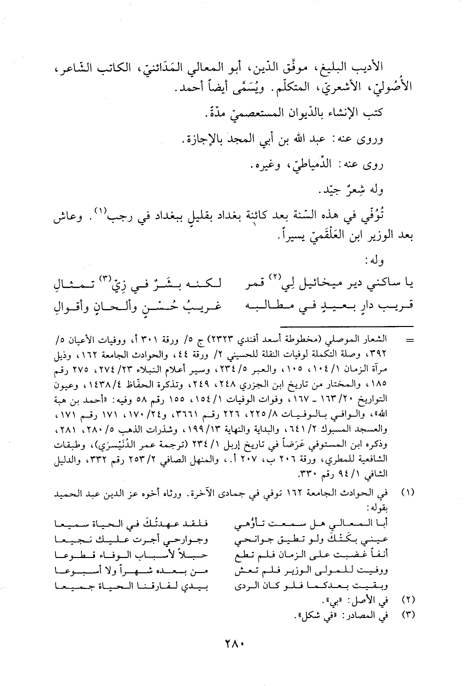 [1] في الحوادث الجامعة 162 توفي في جمادى الآخرة. ورثاه أخوه عز الدين عبد الحميد بقوله: