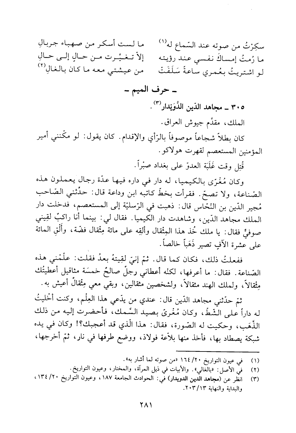 ثُمَّ حدَّثني مجاهد الدّين قَالَ: عندي مِنْ يدّعي هذا العلم، وكنت أخليت لَهُ دارا عَلَى الشّطّ، وكان مُغْري بصيد السّمك، فأحضرت إِليْهِ مِنْ ذَلِكَ الذّهب، وحكيت لَهُ الصّورة، فقال: هذا الَّذِي قد أعجبك؟! وكان فِي يده شبكة يصطاد بها، فأخذ منها بلّاعة فولاذ، ووضع طرفها فِي نار، ثمّ أخرجها،