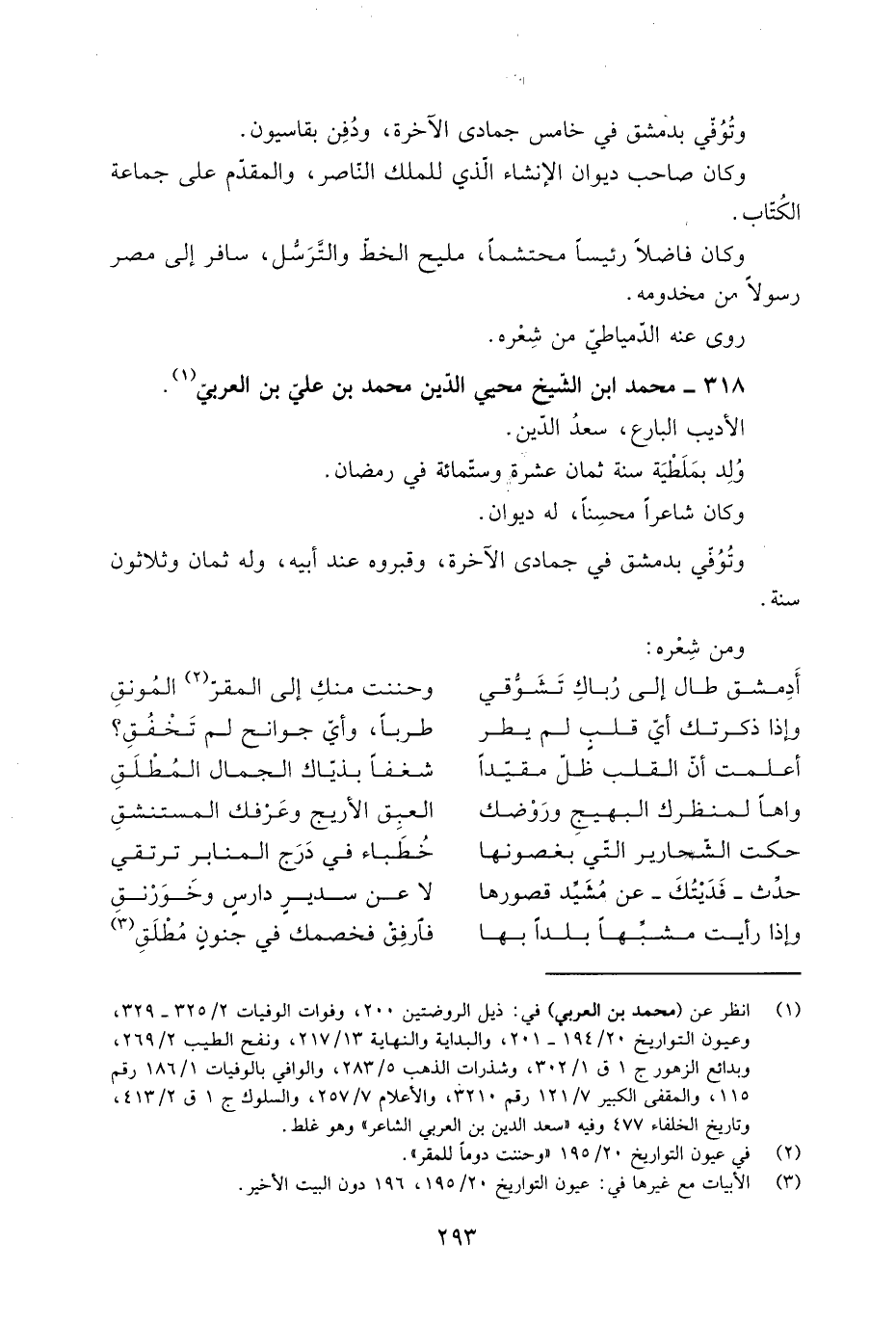 [1] انظر عن (محمد بن العربيّ) في: ذيل الروضتين 200، وفوات الوفيات 2/ 325- 329، وعيون التواريخ 20/ 194- 201، والبداية والنهاية 13/ 217، ونفح الطيب 2/ 269، وبدائع الزهور ج 1 ق 1/ 302، وشذرات الذهب 5/ 283، والوافي بالوفيات 1/ 186 رقم 115، والمقفى الكبير 7/ 121 رقم 3210، والأعلام 7/ 257، والسلوك ج 1 ق 2/ 413، وتاريخ الخلفاء 477 وفيه «سعد الدّين بن العربيّ الشاعر» وهو غلط.