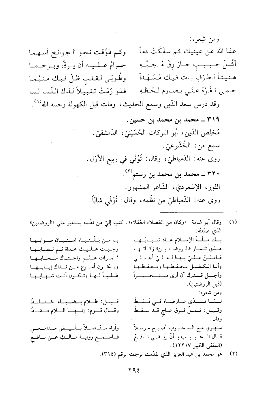 [1] وقال أبو شامة: «وكان من الفضلاء العقلاء» . كتب إليّ من نظمه يستعير مني «الروضتين» الّذي صنّفته: