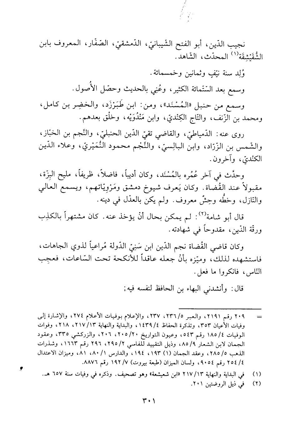 وحدَّث فِي آخر عُمُره بالمُسْنَد، وكان أديبا، فاضلا، ظريفا، مليح البِزة، مقبولا عند القُضاة. وكان يَعرف شيوخ دمشق ومرويّاتهم، ويسمع العالي والنّازل، وخطّه وحشٌ معروف. ولم يكن بالعدْل فِي دينه.