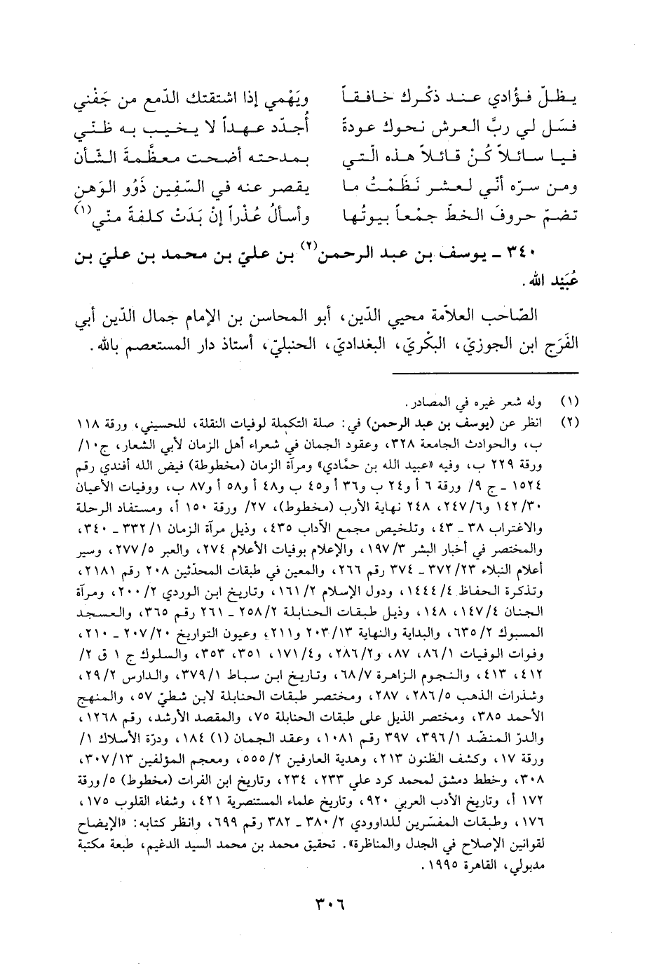 [2] انظر عن (يوسف بن عبد الرحمن) في: صلة التكملة لوفيات النقلة، للحسيني، ورقة 118 ب، والحوادث الجامعة 328، وعقود الجمان في شعراء أهل الزمان لأبي الشعار، ج 10/ ورقة 229 ب، وفيه «عبيد الله بن حمّادي» ومرآة الزمان (مخطوطة) فيض الله أفندي رقم 1524- ج 9/ ورقة 6 أو 24 ب و 36 أو 45 ب 48 أو 58 أو 87 ب، ووفيات الأعيان 30/ 142 و 6/ 247، 248 نهاية الأرب (مخطوط) ، 27/ ورقة 150 أ، ومستفاد الرحلة والاغتراب 38- 43، وتلخيص مجمع الآداب 435، وذيل مرآة الزمان 1/ 332- 340، والمختصر في أخبار البشر 3/ 197، والإعلام بوفيات الأعلام 274، والعبر 5/ 277، وسير أعلام النبلاء 23/ 372- 374 رقم 266، والمعين في طبقات المحدّثين 208 رقم 2181، وتذكرة الحفاظ 4/ 1444، ودول الإسلام 2/ 161، وتاريخ ابن الوردي 2/ 200، ومرآة الجنان 4/ 147، 148، وذيل طبقات الحنابلة 2/ 258- 261 رقم 365، والعسجد المسبوك 2/ 635، والبداية والنهاية 13/ 203 و 211، وعيون التواريخ 20/ 207- 210، وفوات الوفيات 1/ 86، 87، و 2/ 286، و 4/ 171، 351، 353، والسلوك ج 1 ق 2/ 412، 413، والنجوم الزاهرة 7/ 68، وتاريخ ابن سباط 1/ 379، والدارس 2/ 29، وشذرات الذهب 5/ 286، 287، ومختصر طبقات الحنابلة لابن شطيّ 57، والمنهج الأحمد 385، ومختصر الذيل على طبقات الحنابلة 75، والمقصد الأرشد، رقم 1268، والدرّ المنضّد 1/ 396، 397 رقم 1081، وعقد الجمان (1) 184، ودرّة الأسلاك 1/ ورقة 17، وكشف الظنون 213، وهدية العارفين 2/ 555، ومعجم المؤلفين 13/ 307، 308، وخطط دمشق لمحمد كردعلي 233، 234، وتاريخ ابن الفرات (مخطوط) 5/ ورقة 172 أ، وتاريخ الأدب العربيّ 920، وتاريخ علماء المستنصرية 421، وشفاء القلوب 175، 176، وطبقات المفسّرين للداوديّ 2/ 380- 382 رقم 699، وانظر كتابه: «الإيضاح لقوانين الإصلاح في الجدل والمناظرة» . تحقيق محمد بن محمد السيد الدغيم، طبعة مكتبة مدبولي، القاهرة 1995.