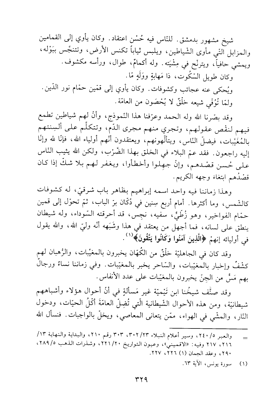 وهذا زماننا فيه واحد اسمه إبراهيم بظاهر باب شرقيّ، لَهُ كشوفات كالشّمس، وما أكثرها. أمام أربع سِنين فِي دكّان برّ الْبَابُ، ثُمَّ تحوّل إلى قمين حمّام الفواخير، وهو زُطي، سفيه، نجِس، قد أحرقته السّوداء، وله شيطان ينطق عَلَى لسانه، فما أجهل من يعتقد فِي هذا وشبهه أَنَّهُ وُلّي الله، والله يَقُولُ فِي أوليائه إنهم الَّذِينَ آمَنُوا وَكانُوا يَتَّقُونَ 10: 63 [1] .