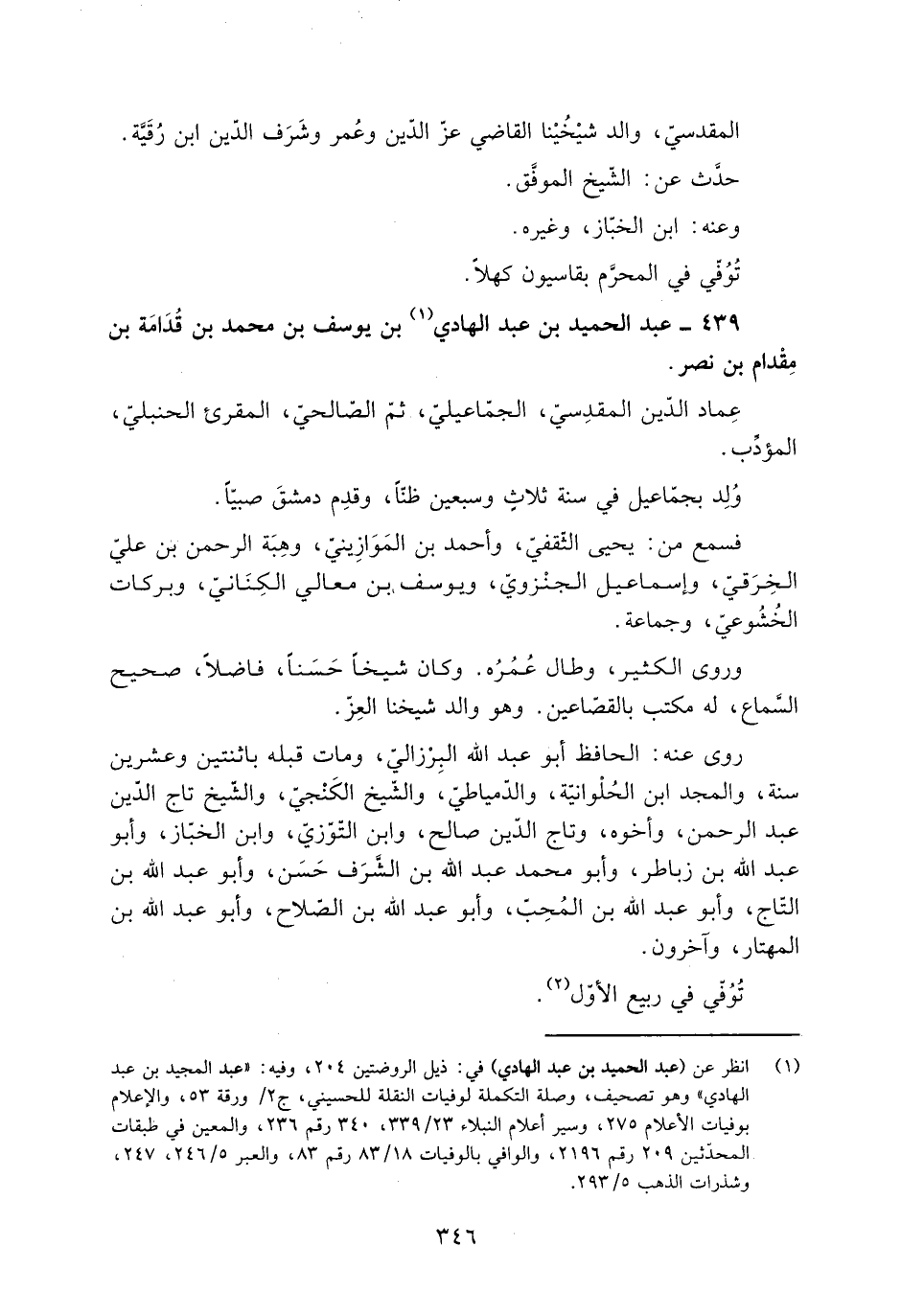 439- عَبْد الحميد بْن عَبْد الهادي [1] بْن يوسف بْن مُحَمَّد بْن قُدَامة بْن مِقْدام بْن نصر.