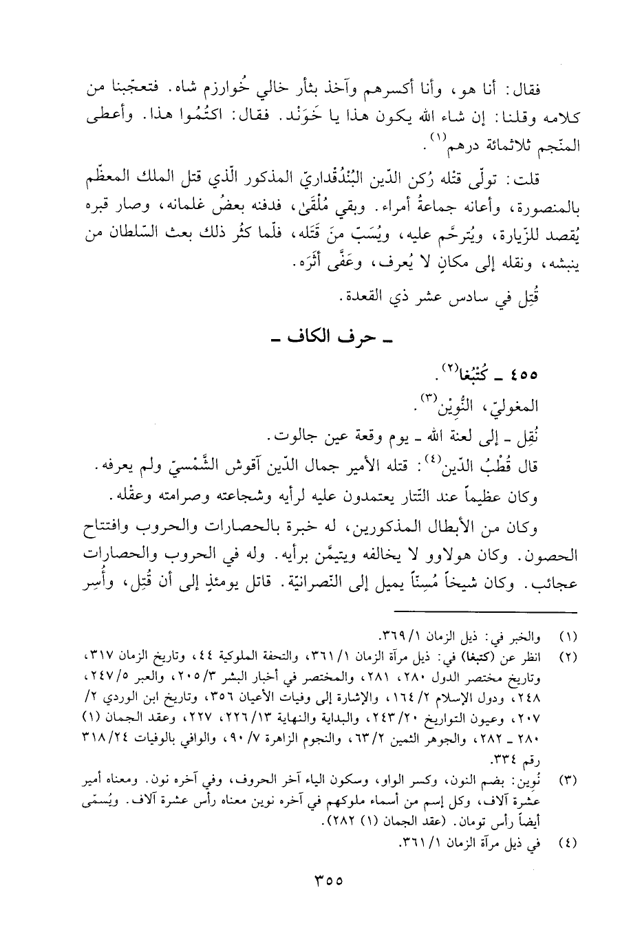 [2] انظر عن (كتبغا) في: ذيل مرآة الزمان 1/ 361، والتحفة الملوكية 44، وتاريخ الزمان 317، وتاريخ مختصر الدول 280، 281، والمختصر في أخبار البشر 3/ 205، والعبر 5/ 247، 248، ودول الإسلام 2/ 164، والإشارة إلى وفيات الأعيان 356، وتاريخ ابن الوردي 2/ 207، وعيون التواريخ 20/ 243، والبداية والنهاية 13/ 226، 227، وعقد الجمان (1) 280- 282، والجوهر الثمين 2/ 63، والنجوم الزاهرة 7/ 90، والوافي بالوفيات 24/ 318 رقم 334.