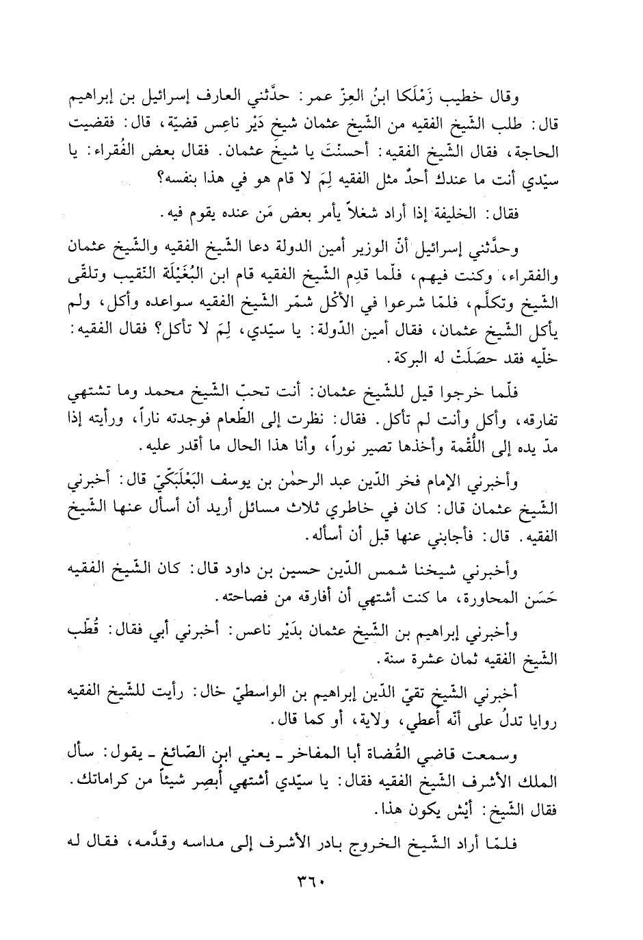 وأخبرني الإمام فخر الدّين عَبْد الرَّحْمَن بْن يوسف البَعْلَبَكِّيّ قَالَ: أخبرني الشَّيْخ عثمان قَالَ: كَانَ فِي خاطري ثلاث مسائل أريد أن أسأل عَنْهَا الشَّيْخ الْفَقِيهُ. قَالَ: فأجابني عَنْهَا قبل أن أسأله.
