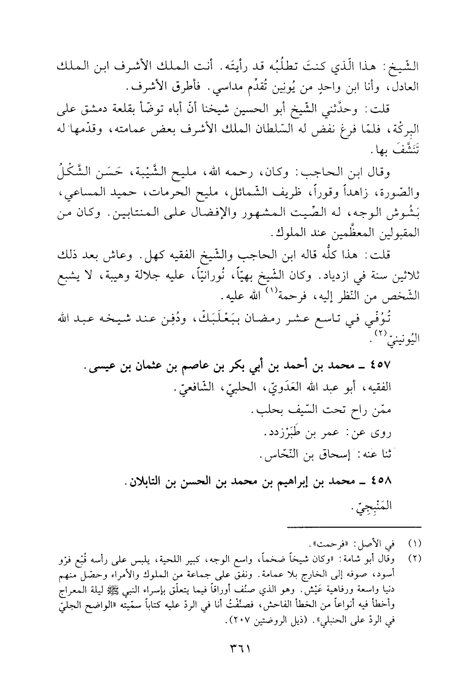 قلت: وحدّثني الشَّيْخ أبو الحُسَيْن شيخنا أنّ أَبَاهُ توضّأ بقلعة دمشق عَلَى البركة، فلمّا فرغ نفض لَهُ السُّلطان المُلْك الأشرف بعض عمامته، وقدّمها لَهُ تَنَشَّفَ بها.