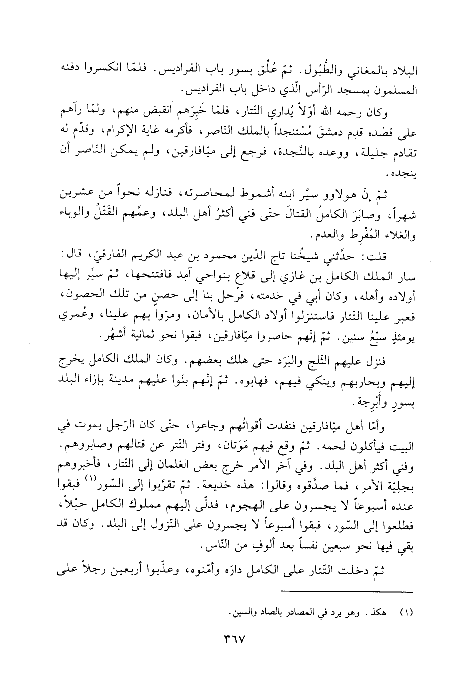 وأمّا أهل ميّافارقين فنفدت أقواتُهم وجاعوا، حتّى كَانَ الرّجل يموت فِي البيت فيأكلون لحمه. ثُمَّ وقع فيهم مَوَتان، وفتر التّتر عن قتالهم وصابروهم.
