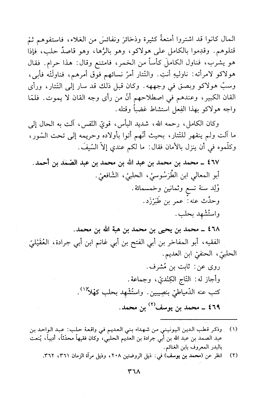 المال كانوا قد اشتروا أمتعةُ كثيرة وذخائرَ ونفائس من الغلاء، فاستفوهم ثُمَّ قتلوهم. وقدموا بالكامل عَلَى هولاكو، وهو بالرّها، وهو قاصدٌ حلب، فإذا هُوَ يشرب، فناول الكاملَ كأسا من الخمر، فامتنع وقال: هذا حرام. فقال هولاكو لامرأته: ناوليه أنتِ. والتّتار أمرُ نسائهم فوق أمرهم، فناولَتْه فأبى، وسبّ هولاكو وبصق فِي وجهه. وكان قبل ذَلِكَ قد سار إلى التّتار، ورأى القان الكبير، وعندهم فِي اصطلاحهم أنّ من رأى وجه القان لَا يموت. فلمّا واجه هولاكو بهذا الفِعل استشاط غضبا وقتله.