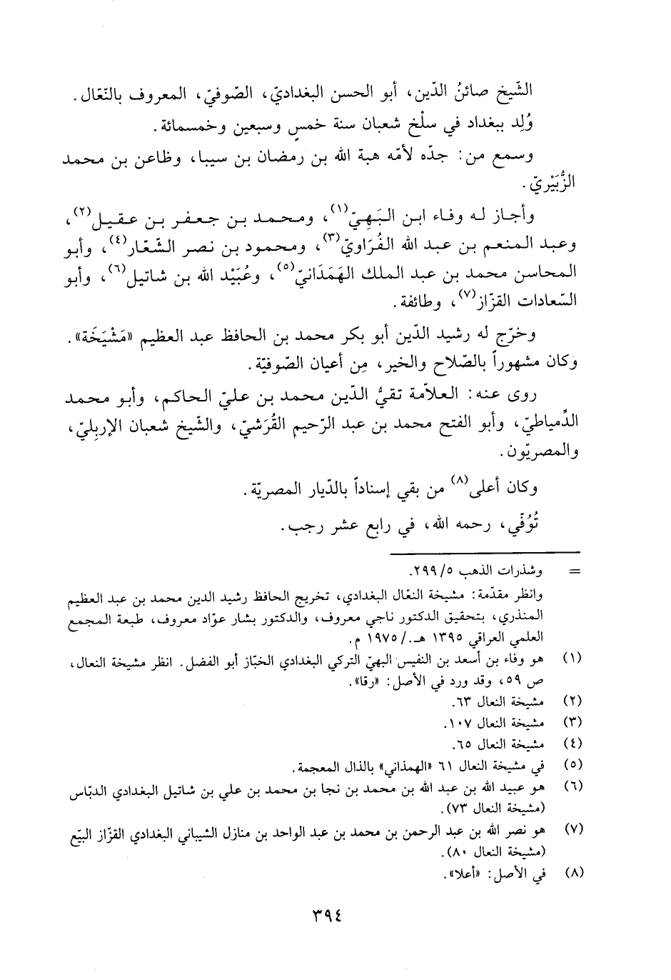 وانظر مقدّمة: مشيخة النّعال البغدادي، تخريج الحافظ رشيد الدين محمد بن عبد العظيم المنذري، بتحقيق الدكتور ناجي معروف، والدكتور بشار عوّاد معروف، طبعة المجمع العملي العراقي 1395 هـ. / 1975 م.