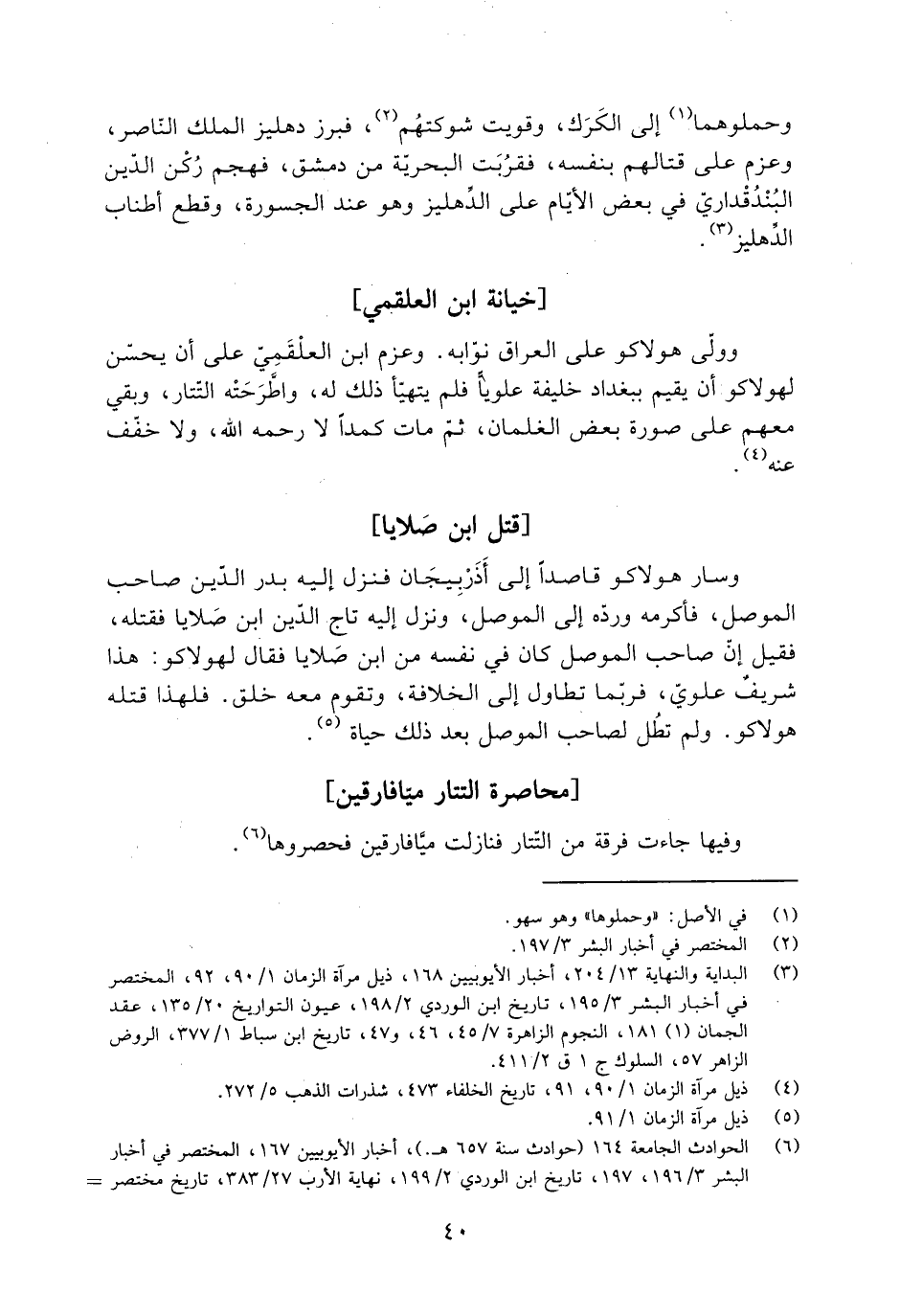 [6] الحوادث الجامعة 164 (حوادث سنة 657 هـ.) ، أخبار الأيوبيين 167، المختصر في أخبار البشر 3/ 196، 197، تاريخ ابن الوردي 2/ 199، نهاية الأرب 27/ 383، تاريخ مختصر