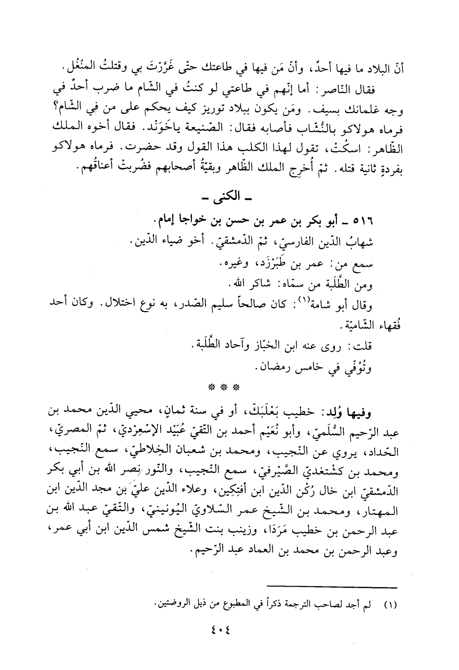 [1] لم أجد لصاحب الترجمة ذكرا في المطبوع من ذيل الروضتين.
