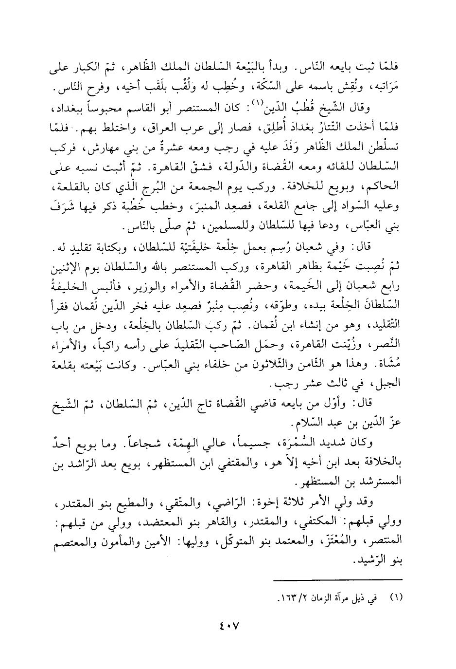 وقال الشَّيْخ قُطْبُ الدّين [1] : كَانَ المستنصر أبو القاسم محبوسا ببغداد، فلمّا أخذت التّتار بغداد أطلق، فصار إلى عرب العراق، واختلط بهم. فلمّا تسلطن المُلْك الظّاهر وَفَدَ عليه فِي رجب ومعه عشرةٌ من بني مهارش، فركب السُّلطان للقائه ومعه القُضاة والدّولة، فشقّ القاهرة. ثُمَّ أثبت نسبه عَلَى الحاكم، وبويع للخلافة. وركب يوم الجمعة من البُرج الَّذِي كَانَ بالقلعة، وعليه السّواد إلى جامع القلعة، فصعِد المنبرَ، وخطب خُطْبة ذكر فيها شَرَفُ بني العبّاس، ودعا فيها للسّلطان وللمسلمين، ثُمَّ صلّى بالنّاس.
