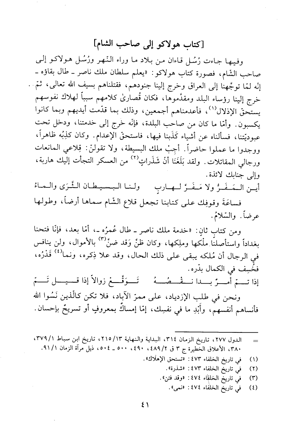 ومن كتابٍ ثان: «خدمة ملك ناصر- طال عُمرُه-، أمّا بعد، فإنّا فتحنا بغداد واستأصلنا. ملْكها وملِكها، وكان ظنّ وَقد ضنّ [3] بالأموال، ولن ينافس فِي الرجال أن مُلكه يبقى على ذلك الحال، وقد علا ذِكره، ونما [4] قَدْرُه، فخُسِف فِي الكمال بدْره.