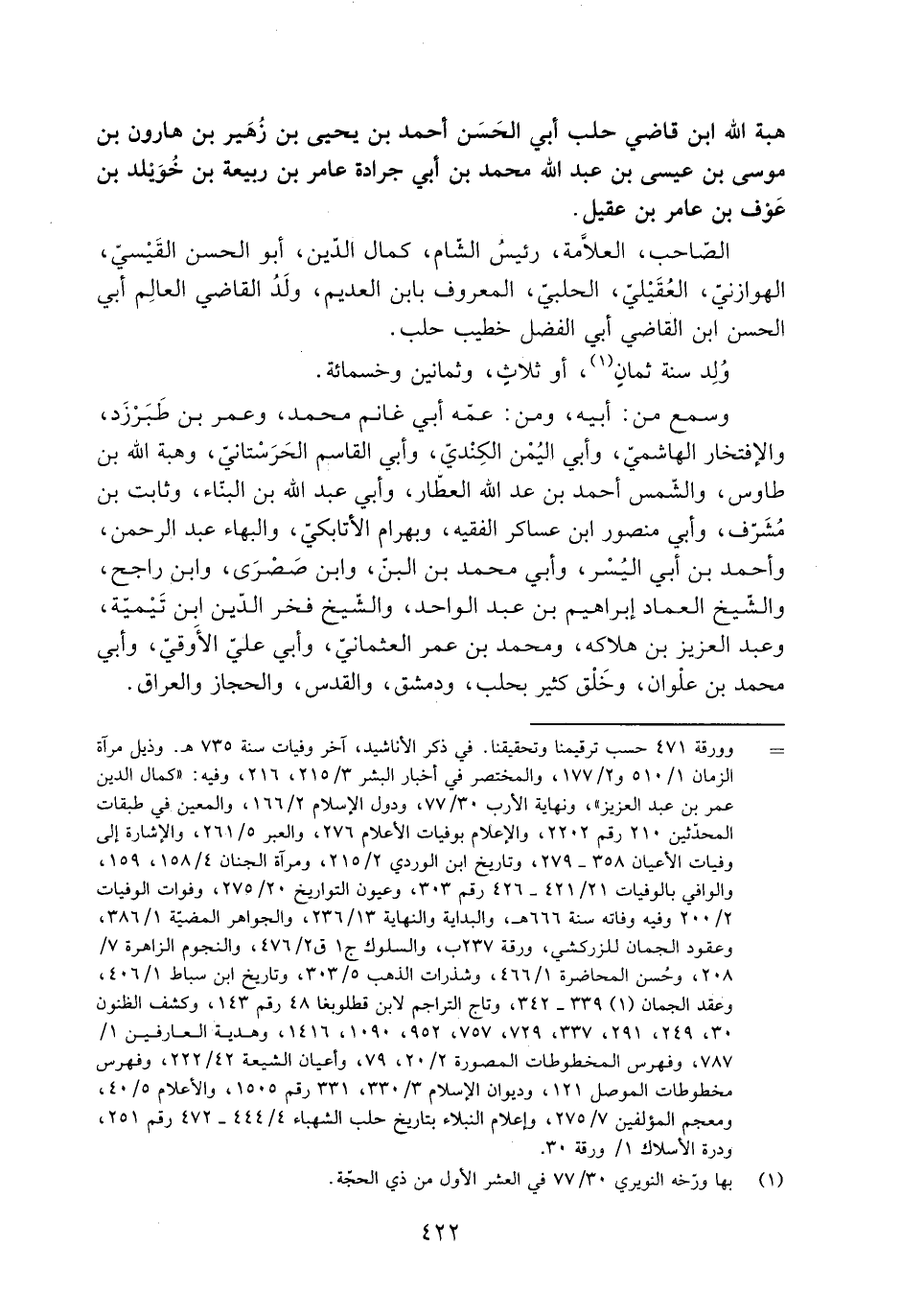 [ () ] وورقة 471، حسب ترقيمنا وتحقيقنا. في ذكر الاناشيد، آخر وفيات سنة 735 هـ. وذيل مرآة الزمان 1/ 510 و 2/ 177، والمختصر في أخبار البشر 3/ 215، 216، وفيه: «كمال الدين عمر بن عبد العزيز» ، ونهاية الأرب 30/ 77، ودول الإسلام 2/ 166، والمعين في طبقات المحدّثين 210 رقم 2202، والإعلام بوفيات الأعلام 276، والعبر 5/ 261، والإشارة إلى وفيات الأعيان 358- 279، وتاريخ ابن الوردي 2/ 215، ومرآة الجنان 4/ 158، 159، والوافي بالوفيات 21/ 421- 426 رقم 303، وعيون التواريخ 20/ 275، وفوات الوفيات 2/ 200 وفيه وفاته سنة 666 هـ، والبداية والنهاية 13/ 236، والجواهر المضية 1/ 386، وعقود الجمان للزركشي، ورقة 237 ب، والسلوك ج 1 ق 2/ 476، والنجوم الزاهرة 7/ 208، وحسن المحاضرة 1/ 466، وشذرات الذهب 5/ 303، وتاريخ ابن سباط 1/ 406، وعقد الجمان (1) 339- 342، وتاج التراجم لابن قطلوبغا 48 رقم 143، وكشف الظنون 30، 249، 291، 337، 729، 757، 952، 1090، 1416، وهدية العارفين 1/ 787، وفهرس المخطوطات المصورة 2/ 20، 79، وأعيان الشيعة 42/ 222، وفهرس مخطوطات الموصل 121، وديوان الإسلام 3/ 330، 331 رقم 1505، والأعلام 5/ 40، ومعجم المؤلفين 7/ 275، وإعلام النبلاء بتاريخ حلب الشهباء 4/ 444- 472 رقم 251، ودرة الأسلاك 1/ ورقة 30.
