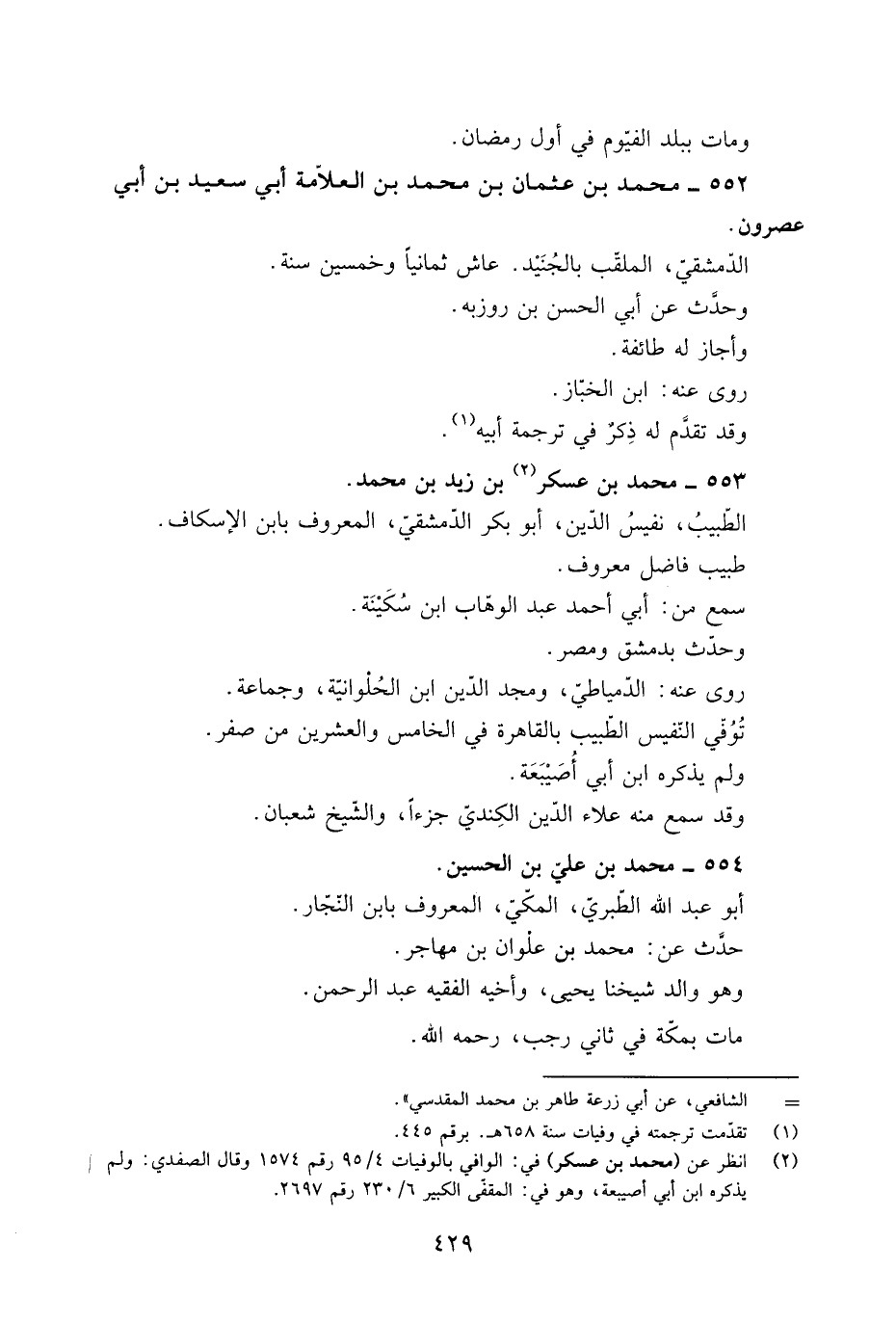 [2] انظر عن (محمد بن عسكر) في: الوافي بالوفيات 4/ 95 رقم 1574 وقال الصفدي: ولم يذكره ابن أبي أصيبعة، وهو في: المقفّى الكبير 6/ 230 رقم 2697.
