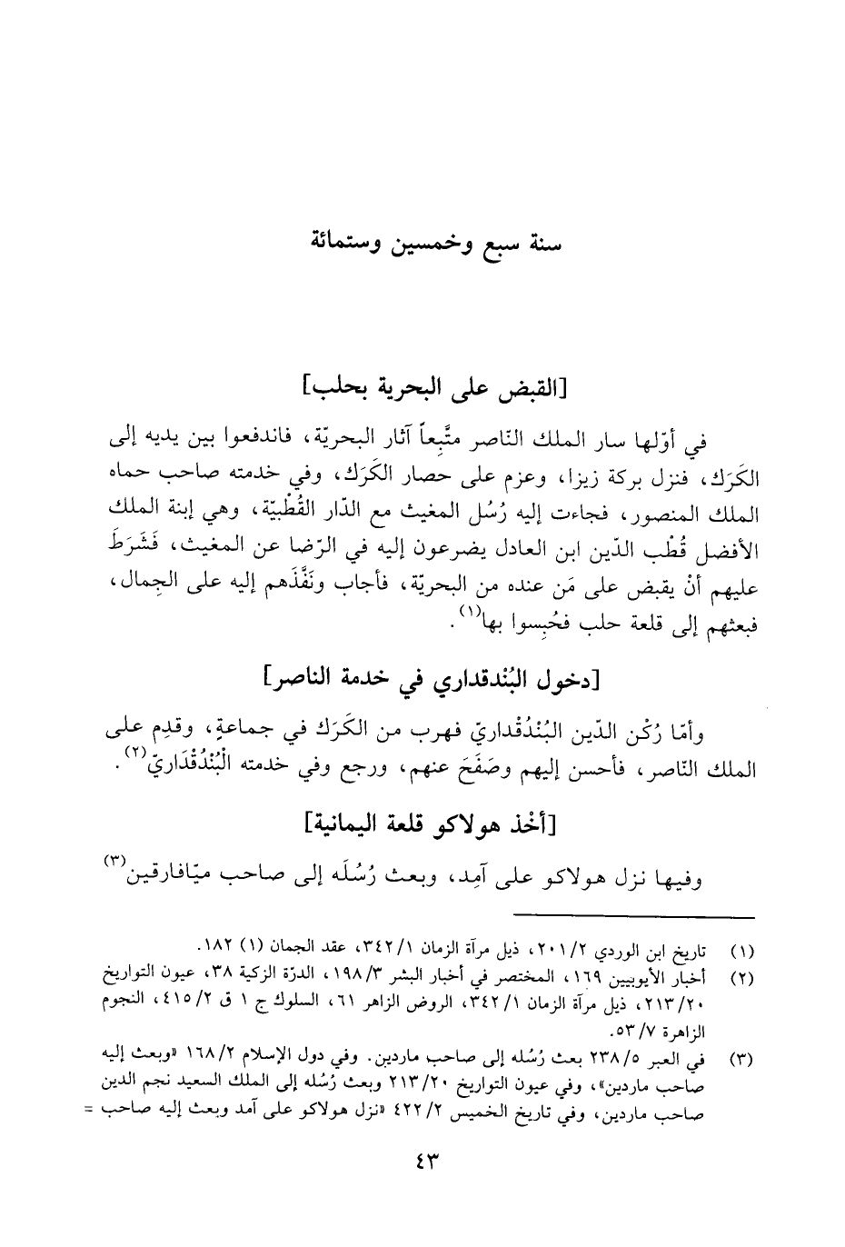 [2] أخبار الأيوبيين 169، المختصر في أخبار البشر 3/ 198، الدرّة الزكية 38، عيون التواريخ 20/ 213، ذيل مرآة الزمان 1/ 342، الروض الزاهر 61، السلوك ج 1 ق 2/ 415، النجوم الزاهرة 7/ 53.