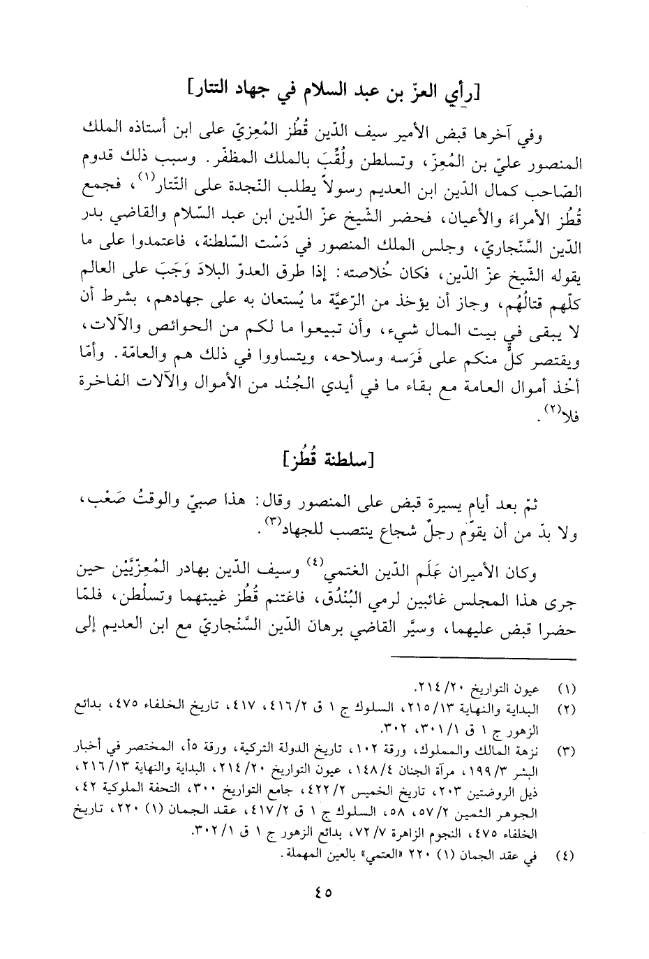 وفي آخرها قبض الأمير سيف الدّين قُطُز المعزيّ على ابن أستاذه الملك المنصور عليّ بن المُعِزّ، وتسلطن ولُقب بالملك المظفّر. وسبب ذلك قدوم الصّاحب كمال الدّين ابن العديم رسولا يطلب النّجدة على التّتار [1] ، فجمع قُطز الأمراء والأعيان، فحضر الشَّيْخ عزّ الدّين ابن عَبْد السّلام والقاضي بدر الدّين السّنجاريّ، وجلس الملك المنصور فِي دَسْت السّلطنة، فاعتمدوا على ما يقوله الشَّيْخ عزّ الدّين، فكان خُلاصته: إذا طرق العدوّ البلادَ وَجَبَ على العالم كلّهم قتالُهُم، وجاز أن يؤخذ من الرّعيّة ما يُستعان به على جهادهم، بشرط أن لا يبقى فِي بيت المال شيء، وأن تبيعوا ما لكم من الحوائص والآلات، ويقتصر كلّ منكم على فَرَسه وسلاحه، ويتساووا فِي ذلك هُمْ والعامّة. وأمّا أخْذ أموال العامة مع بقاء ما فِي أيدي الْجُنْد من الأموال والآلات الفاخرة فلا [2] .