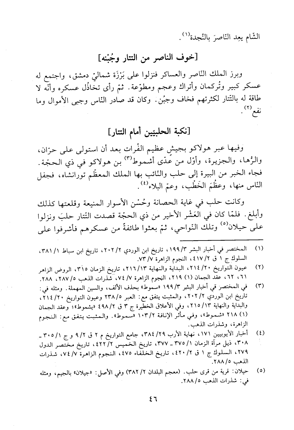 وكانت حلب فِي غاية الحصانة وحُسْن الأسوار المنيعة وقلعتها كذلك وأبلغ. فلمّا كان فِي العَشْر الأخير من ذي الحجّة قصدت التتار حلبَ ونزلوا على حيلان [5] وتلك النّواحي، ثمّ بعثوا طائفة من عسكرهم فأشرفوا على