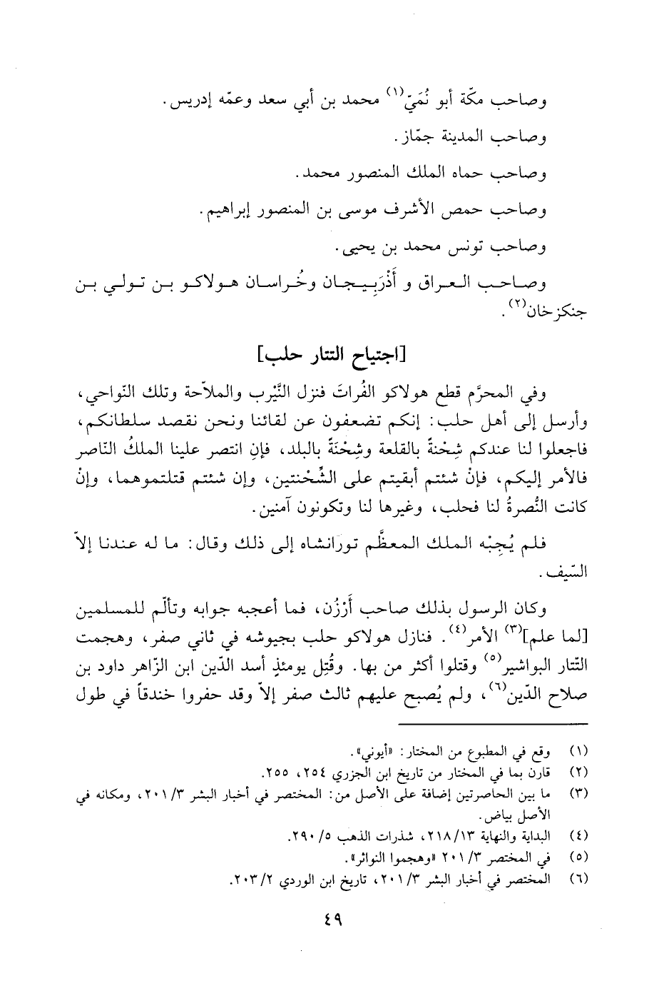 وكان الرَّسُول بذلك صاحب أرْزُن، فما أعجبه جوابه وتألّم للمسلمين [لما علم] [3] الأمر [4] . فنازل هولاكو حلب بجيوشه فِي ثاني صَفَر، وهجمت التّتار البواشير [5] وقتلوا أكثر من بها. وقُتِل يومئذٍ أسد الدّين ابن الزّاهر دَاوُد بن صلاح الدّين [6] ، ولم يُصبح عليهم ثالث صَفَر إلّا وقد حفروا خندقا فِي طول