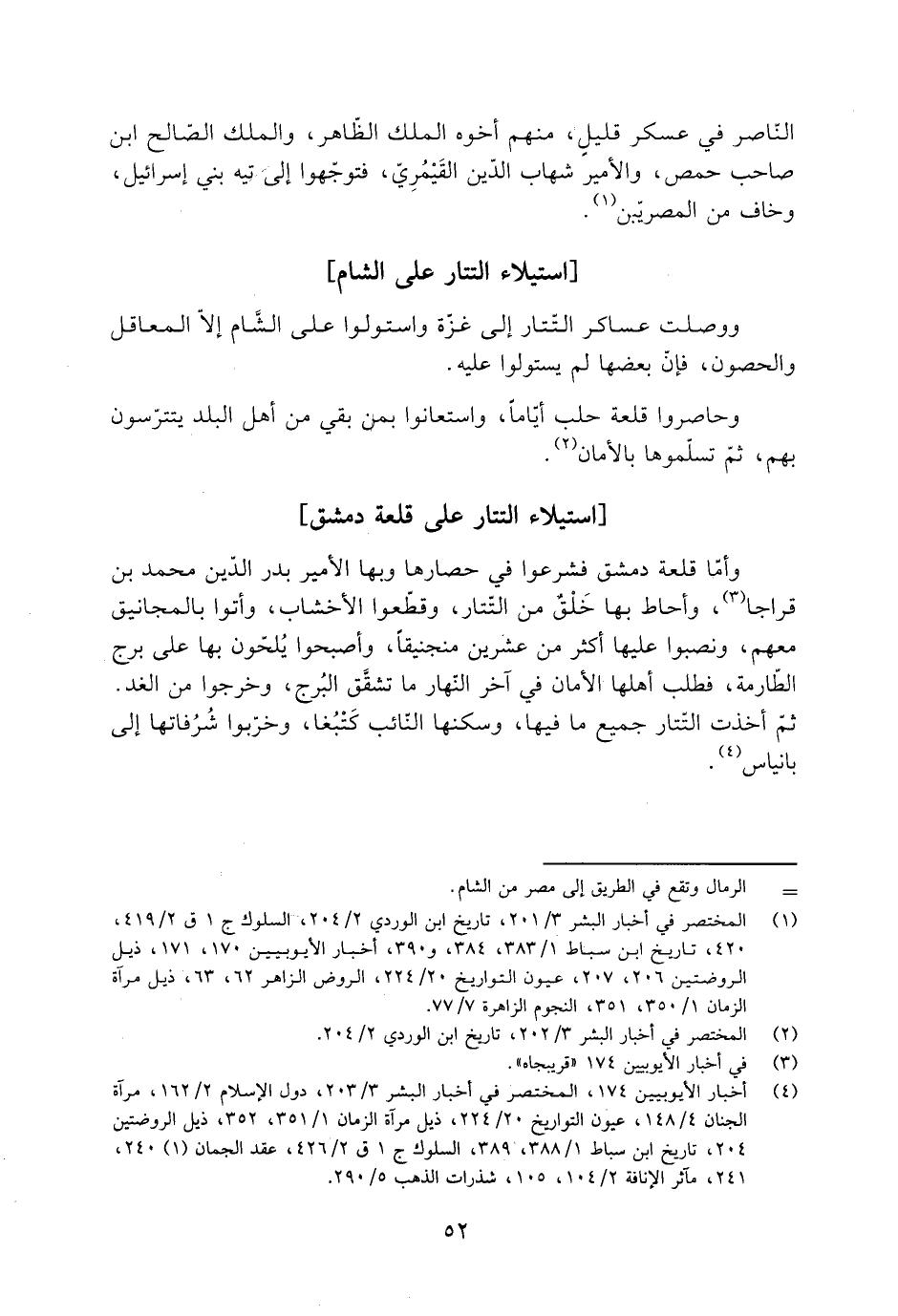 ووصلت عساكر التّتار إلى غزّة واستولوا على الشّام إلّا المعاقل والحصون، فإنّ بعضها لم يستولوا عليه.