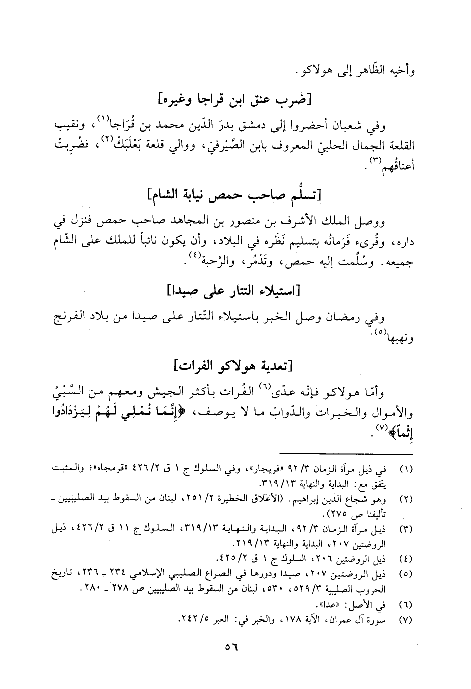 [3] ذيل مرآة الزمان 3/ 92، البداية والنهاية 13/ 319، السلوك ج 11 ق 2/ 426، ذيل الروضتين 207، البداية والنهاية 13/ 219.