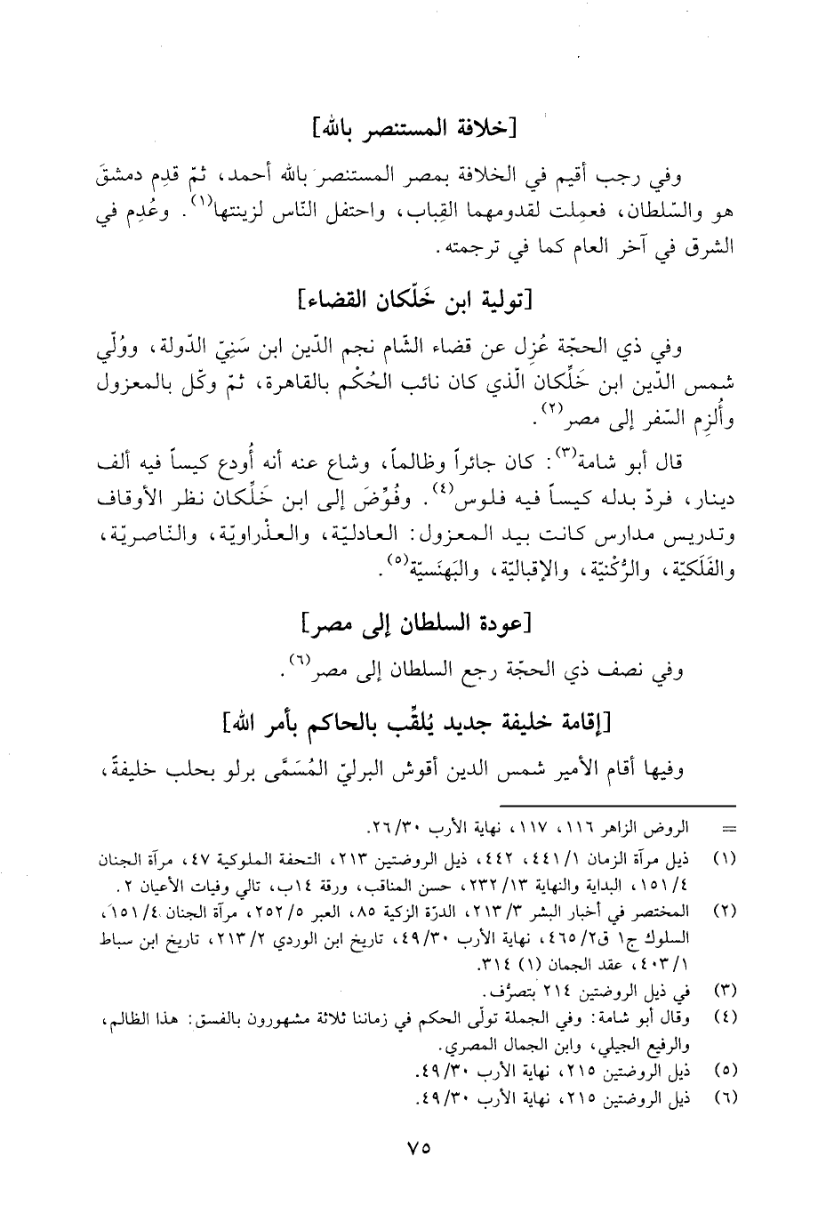 وفي رجب أقيم فِي الخلافة بمصر المستنصر باللَّه أَحْمَد، ثمّ قدِم دمشق هو والسّلطان، فعملت لقدومهما القِباب، واحتفل النّاس لزينتها [1] . وعُدِم فِي الشرق فِي آخر العام كما فِي ترجمته.