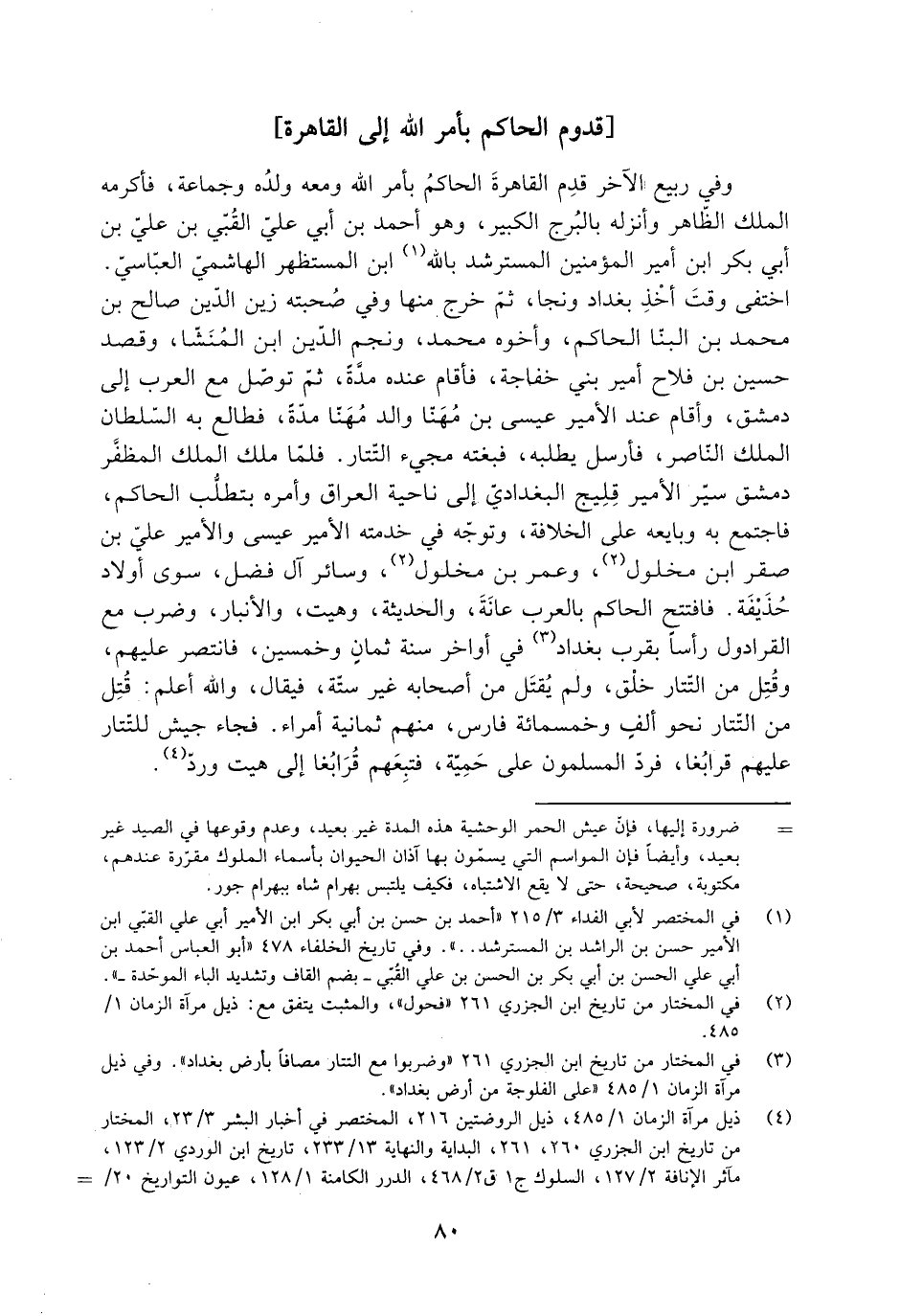 اختفى وقتَ أخْذِ بغداد ونجا، ثمّ خرج منها وفي صُحبته زين الدّين صالح بن مُحَمَّد بن البنّاء الحاكم، وأخوه مُحَمَّد، ونجم الدّين ابن المُنَشا، وقصد حسين بن فلاح أمير بني خفاجة، فأقام عنده مدّة، ثمّ توصّل مع العرب إلى دمشق، وأقام عند الأمير عيسى بن مُهَنَّا والد مهنّا مدّة، فطالع به السُّلطان الملك النّاصر، فأرسل يطلبه، فبغته مجيء التّتار. فلمّا ملك الملك المظفّر دمشق سيّر الأمير قِلِيج البغداديّ إلى ناحية العراق وأمره بتطلّب الحاكم، فاجتمع به وبايعه على الخلافة، وتوجّه فِي خدمته الأمير عيسى والأمير عليّ بن صقر ابن مخلول [2] ، وعمر بن مخلول [2] ، وسائر آل فضل، سوى أولاد حُذَيْفَة. فافتتح الحاكم بالعرب عانَةَ، والحديثة، وهيت، والأنبار، وضرب مع القرادول رأسا بقرب بغداد [3] فِي أواخر سنة ثمانٍ وخمسين، فانتصر عليهم، وقُتِل من التّتار خلْق، ولم يُقتَل من أصحابه غير ستّة، فيقال، والله أعلم: قُتِل من التّتار نحو ألفٍ وخمسمائة فارس، منهم ثمانية أمراء. فجاء جيش للتّتار عليهم قرابُغا، فردّ المسلمون على حَمِية، فتبِعهم قرابغا إلى هيت وردّ [4] .