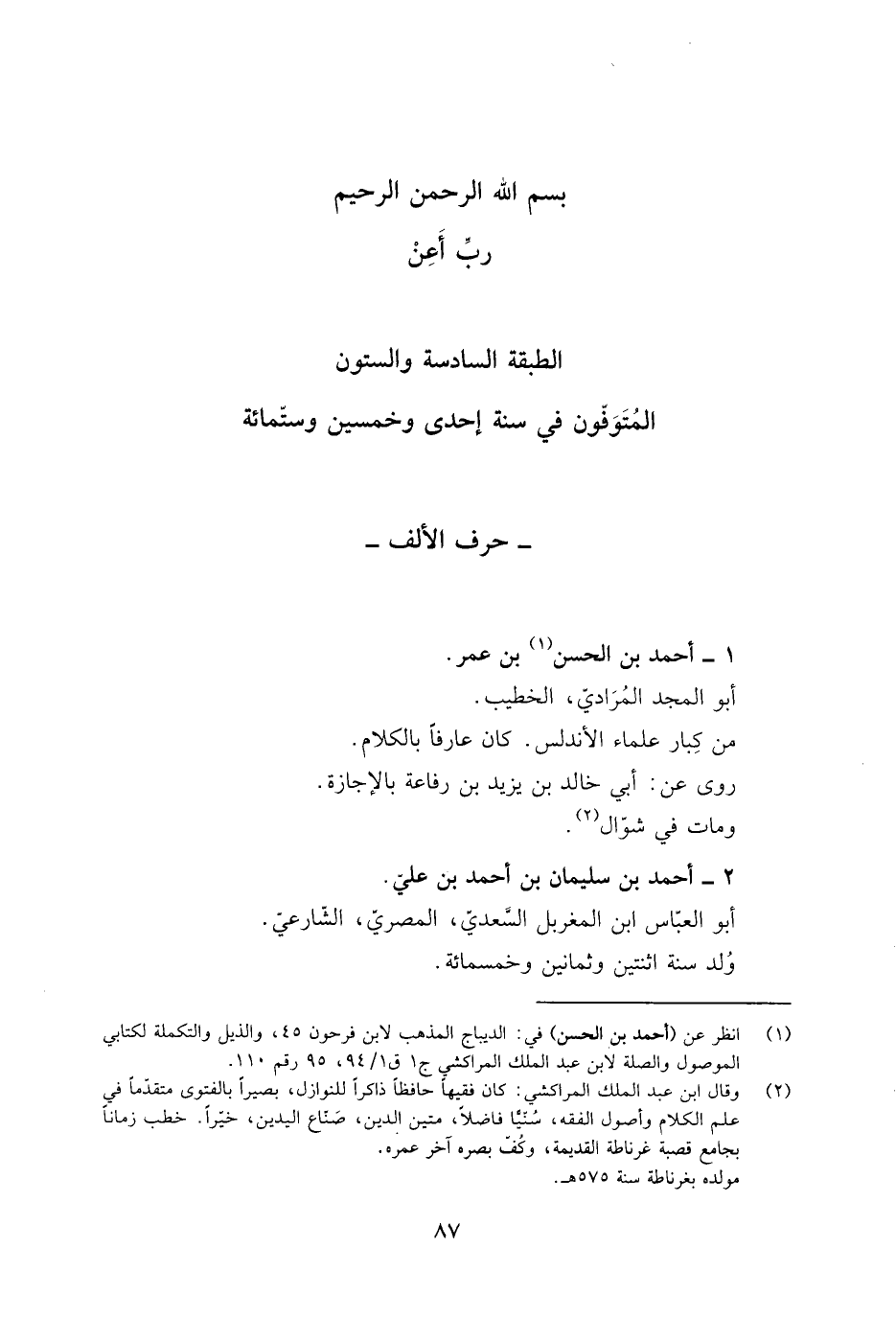 [1] انظر عن (أحمد بن الحسن) في: الديباج المذهب لابن فرحون 45، والذيل والتكملة لكتابي الموصول والصلة لابن عبد الملك المراكشي ج 1 ق 1/ 94، 95 رقم 110.