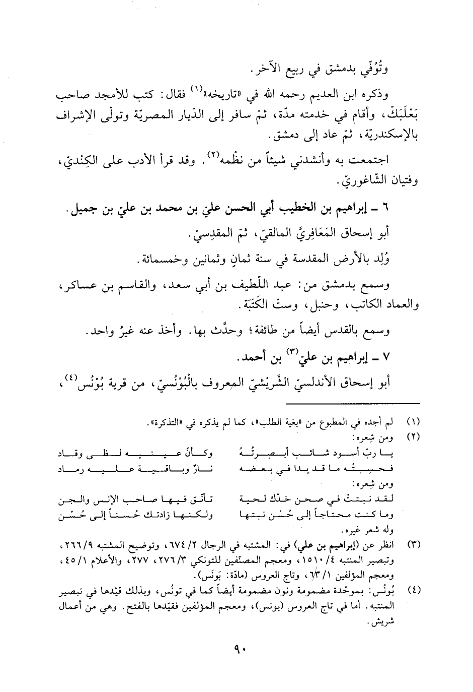 [3] انظر عن (إبراهيم بن علي) في: المشتبه في الرجال 2/ 674، وتوضيح المشتبه 9/ 266، وتبصير المنتبه 4/ 1510، ومعجم المصنّفين للتونكي 3/ 276، 277، والأعلام 1/ 45، ومعجم المؤلفين 1/ 63، وتاج العروس (مادّة: بونس) .