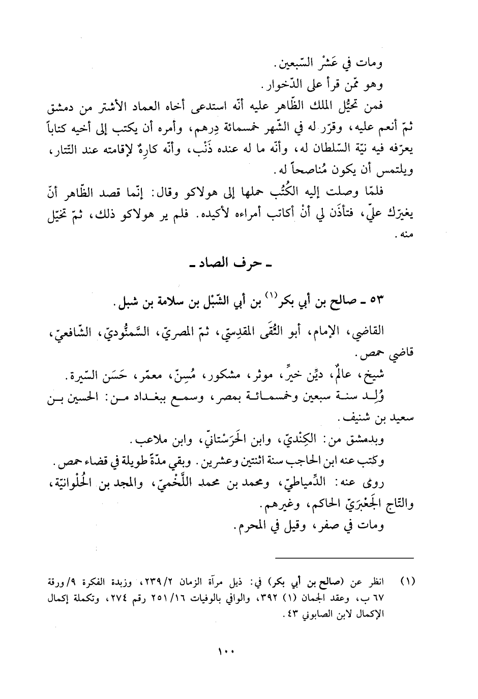 [1] انظر عن (صالح بن أبي بكر) في: ذيل مرآة الزمان 2/ 239، وزبدة الفكرة 9/ ورقة 67 ب، وعقد الجمان (1) 392، والوافي بالوفيات 16/ 251 رقم 274، وتكملة إكمال الإكمال لابن الصابوني 43.