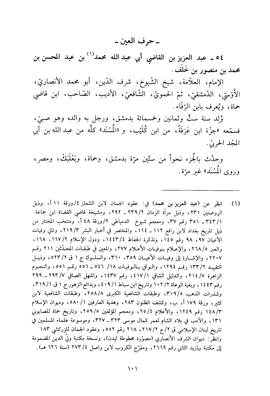 [1] انظر عن (عبد العزيز بن محمد) في: عقود الجمان لابن الشعار 4/ ورقة 11 أ، وذيل الروضتين 231، وذيل مرآة الزمان 2/ 239- 292، ومشيخة قاضي القضاة ابن جماعة 1/ 343- 351 رقم 37، ومعجم شيوخ الدمياطيّ 2/ ورقة 48 أ، ومنتخب المختار من ذيل تاريخ بغداد لابن رافع 112- 114، والمختصر في أخبار البشر 3/ 219، وتالي وفيات الأعيان 97، 98 رقم 145، وتذكرة الحفاظ 4/ 1443، ودول الإسلام 2/ 167، 168، والعبر 5/ 268، والإعلام بوفيات الأعلام 277، والمعين في طبقات المحدّثين 211 رقم 2207 والإشارة إلى وفيات الأعيان 359، 360، والسلوك ج 1 ق 2/ 523، وذيل التقييد 2/ 133 رقم 1294، والوافي بالوفيات 18/ 546- 556 رقم 551، والنجوم الزاهرة 7/ 214، والدليل الشافي 1/ 417، رقم 1437، والمنهل الصافي 7/ 293- 299 رقم 1443، وبغية الوعاة 2/ 102 وتاريخ ابن سباط 1/ 409، وبدائع الزهور ج 1 ق 1/ 319، وشذرات الذهب 5/ 309، وطبقات الشافعية الكبرى 8/ 258، وطبقات الشافعية لابن كثير، ورقة 179 أ، ب، وكشف الظنون 283، وهدية العارفين 1/ 580، وديوان الإسلام 3/ 148 رقم 1249، والأعلام 4/ 25، ومعجم المؤلفين 5/ 259، وتاريخ حماة للصابوني 131، والأدب في بلاد الشام لعمر كمال موسى 323- 327، وموسوعة علماء المسلمين في تاريخ لبنان الإسلامي ق 2/ ج 2/ 217، 218 رقم 552، وعقود الجمان للزركشي 183.