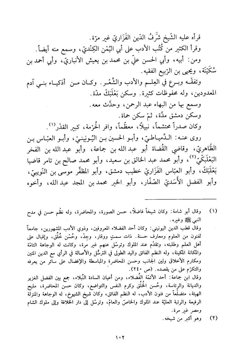 وتفقّه وبرع في العِلْم والأدب والشّعر. وكان من أذكياء بني آدم المعدودين، وله محفوظات كثيرة. وسكن بَعْلَبَكّ مدّة.