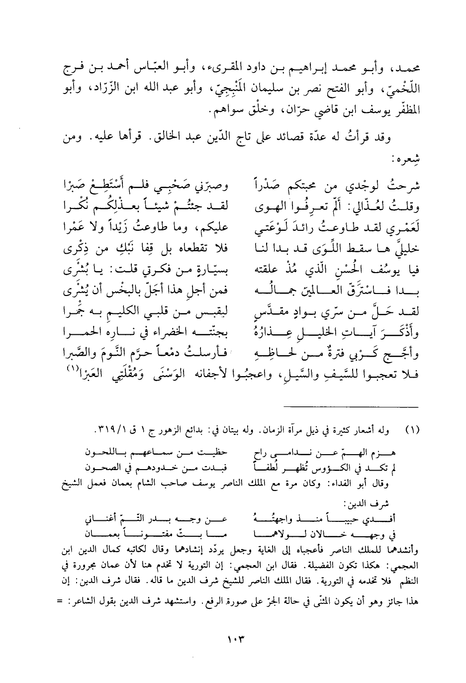 وأنشدهما للملك الناصر فأعجباه إلى الغاية وجعل يردّد إنشادهما وقال لكاتبه كمال الدين ابن العجمي: هكذا تكون الفضيلة. فقال ابن العجمي: إن التوراة لا تخدم هنا لأن عمان مجرورة في النظم فلا تخدمه في التوراة. فقال الملك الناصر للشيخ شرف الدين ما قاله. فقال شرف الدين: إن هذا جائز وهو أن يكون المثنّى في حالة الجرّ على صورة الرفع. واستشهد شرف الدين بقول الشاعر:
