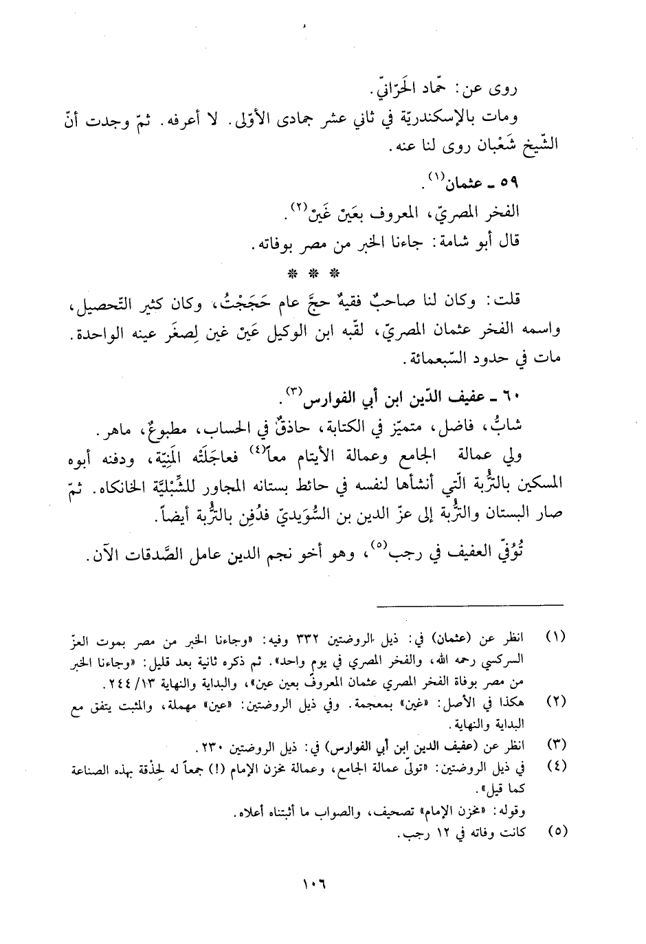 [1] انظر عن (عثمان) في: ذيل الروضتين 332 وفيه: «وجاءنا الخبر من مصر بموت العزّ السركسي رحمه الله، والفخر المصري في يوم واحد» . ثم ذكره ثانية بعد قليل: «وجاءنا الخبر من مصر بوفاة الفخر المصري عثمان المعروف بعين عين» ، والبداية والنهاية 13/ 244.