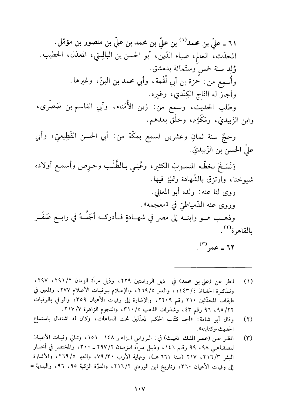 [1] انظر عن (علي بن محمد) في: ذيل الروضتين 229، وذيل مرآة الزمان 2/ 296، 297، وتذكرة الحفاظ 4/ 1443، والعبر 5/ 269، والإعلام بوفيات الأعلام 277، والمعين في طبقات المحدثين 210 رقم 2209، والإشارة إلى وفيات الأعيان 359، والوافي بالوفيات 22/ 95، 96 رقم 43، وشذرات الذهب 5/ 310، والنجوم الزاهرة 7/ 217.