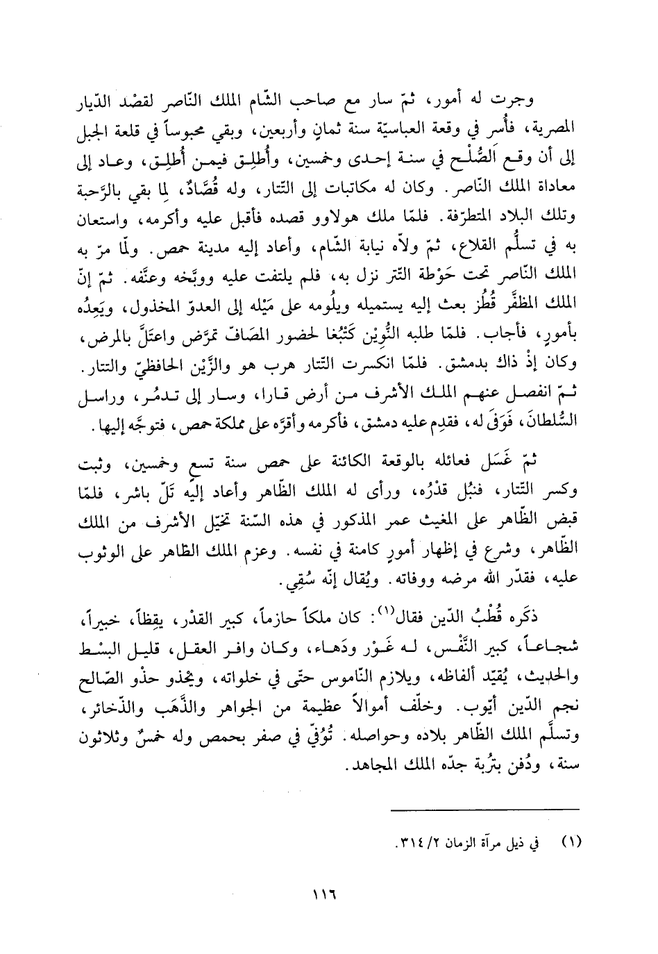 ثمّ غَسَل فعائله بالوقعة الكائنة على حمص سند تسع وخمسين، وثبت وكسر التّتار، فنبُل قدْرُهُ، ورأى له الملك الظّاهر وأعاد إليه تلَّ باشر، فلمّا قبض الظّاهر على المغيث عمر المذكور في هذه السّنة تخيّل الأشرف من الملك الظّاهر، وشرع في إظهار أمورٍ كامنة في نفسه. وعزم الملك الظاهر على الوثوب عليه، فقدّر الله مرضه ووفاته. ويُقال إنّه سُقِي.