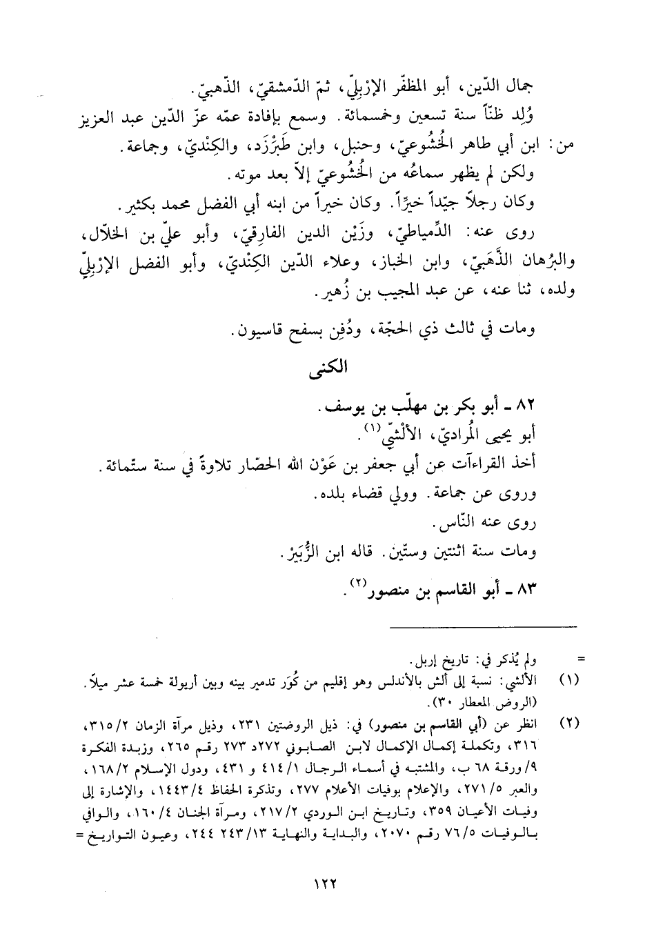 [2] انظر عن (أبي القاسم بن منصور) في: ذيل الروضتين 231، وذيل مرآة الزمان 2/ 315، 316، وتكملة إكمال الإكمال لابن الصابوني 272، 273 رقم 265، وزبدة الفكرة 9/ ورقة 68 ب، والمشتبه في أسماء الرجال 1/ 414 و 431، ودول الإسلام 2/ 168، والعبر 5/ 271، والإعلام بوفيات الأعلام 277، وتذكرة الحفاظ 4/ 1443، والإشارة إلى وفيات الأعيان 359، وتاريخ ابن الوردي 2/ 217، ومرآة الجنان 4/ 160، والوافي بالوفيات 5/ 76 رقم 2070، والبداية والنهاية 13/ 243، 244، وعيون التواريخ