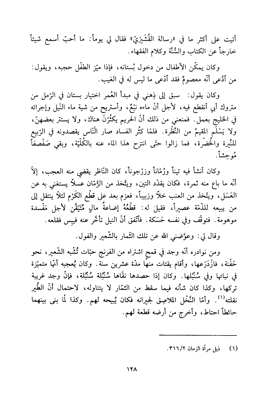وكان أنشأ فيه تينا ورُمّانًا وزرْجونًا، كان النّاظر يقضي منه العجب، إلّا أنّه ما باع منه ثمرة، فكان يقدّد التين، ويتَّخِذ من الرُّمّان عسلا يستغني به عن العَسَل، ويتّخذ من العنب خلا وزبيبا، فعزم بعد على قطْع الكَرْم لئلّا ينتقل إلى من يبيعه للذّمّة عصيرا، فقيل له: قطْعُهُ إضاعةُ مالٍ مُتَيَقَّن لأجل مفْسدة موهومة. فتوقّف وفي نفسه حَسَكة. فاتّفق أنّ النيل تأخّر عنه فيبِس فقلعه.