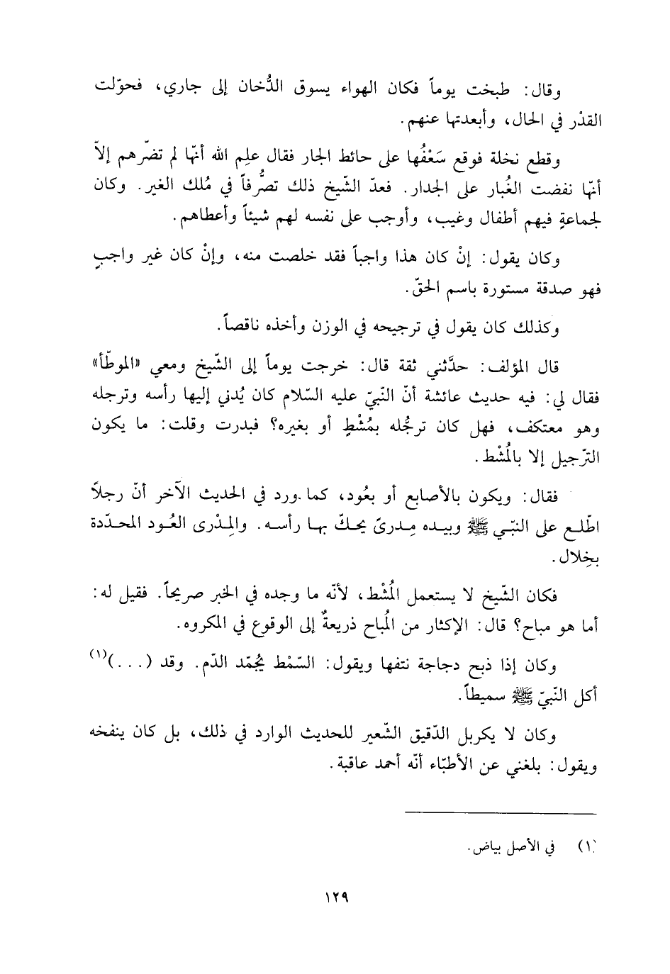 قال المؤلف: حدَّثني ثقة قال: خرجت يوما إلى الشّيخ ومعي «الموطّأ» فقال لي: فيه حديث عائشة أنّ النّبيّ عليه السّلام كان يُدني إليها رأسه وترجله وهو معتكف، فهل كان ترجُّله بمُشْطٍ أو بغيره؟ فبدرت وقلت: ما يكون التَّرجيل إلا بالمُشْط.