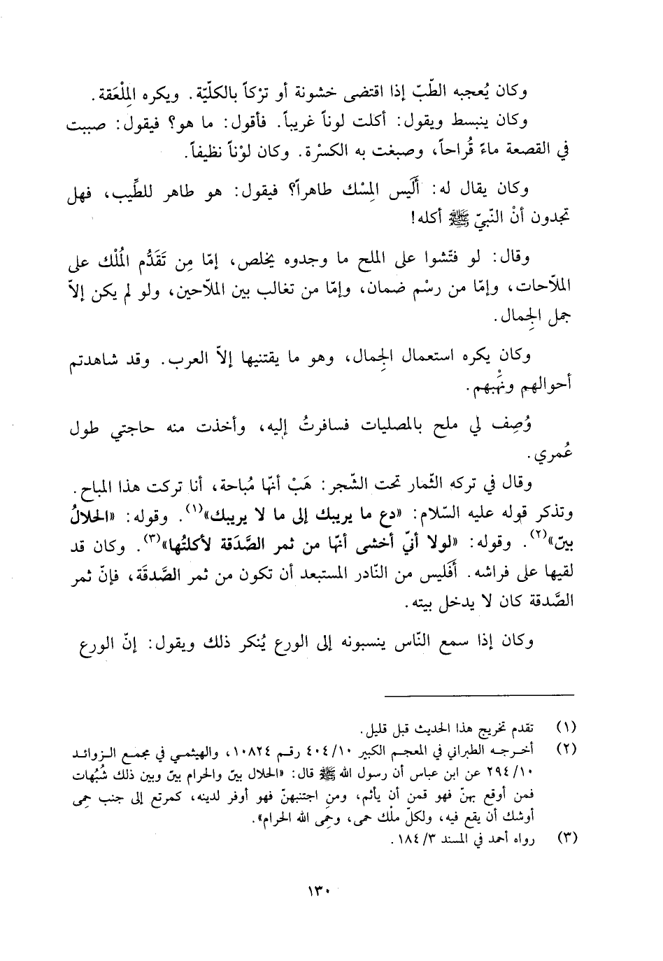 [2] أخرجه الطبراني في المعجم الكبير 10/ 404 رقم 10824، والهيثمي في مجمع الزوائد 10/ 294 عَنِ ابْنِ عَبَّاسٍ أَنّ رَسُولَ اللَّهِ صَلَّى الله عليه وآله وسلم قال: «الحلال بيّن والحرام بيّن وبين ذلك شبهات فمن أوقع بهنّ فهو قمن أن يأثم، ومن اجتنبهنّ فهو أوفر لدينه، كمرتع إلى جنب حمى أوشك أن يقع فيه، ولكلّ ملك حمى، وحمى الله الحرام» .