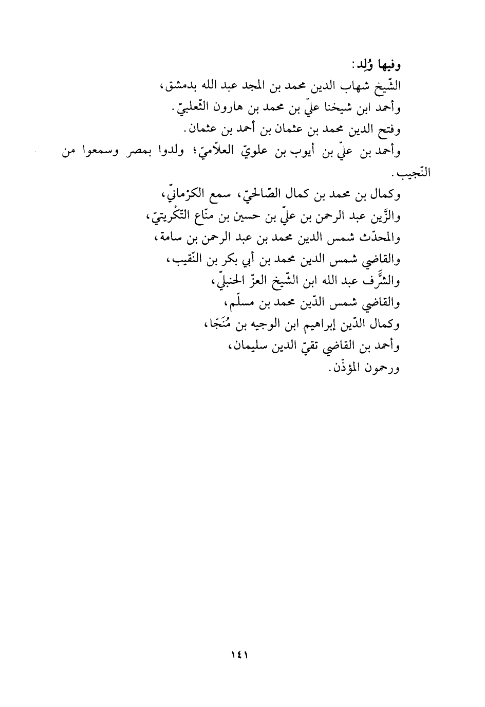 الشّيخ شهاب الدين محمد بن المجد عبد الله بدمشق، وأحمد ابن شيخنا عليّ بن محمد بن هارون الثّعلبيّ.