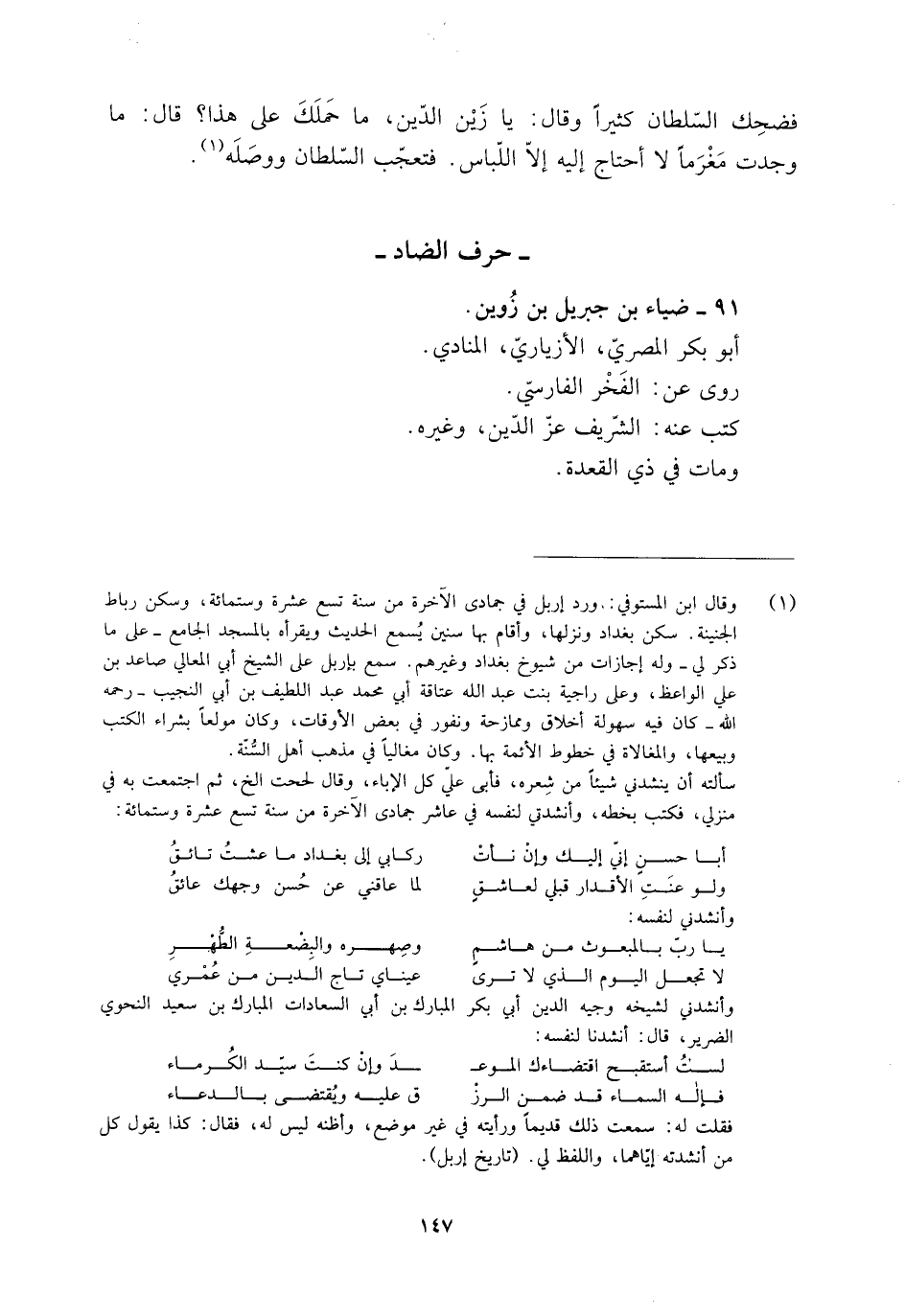 فضحك السّلطان كثيرا وقال: يا زين الدّين، ما حَمَلَك على هذا؟ قال: ما وجدت مَغْرَمًا لا أحتاج إليه إلّا اللّباس. فتعجّب السّلطان ووَصَلَه [1] .