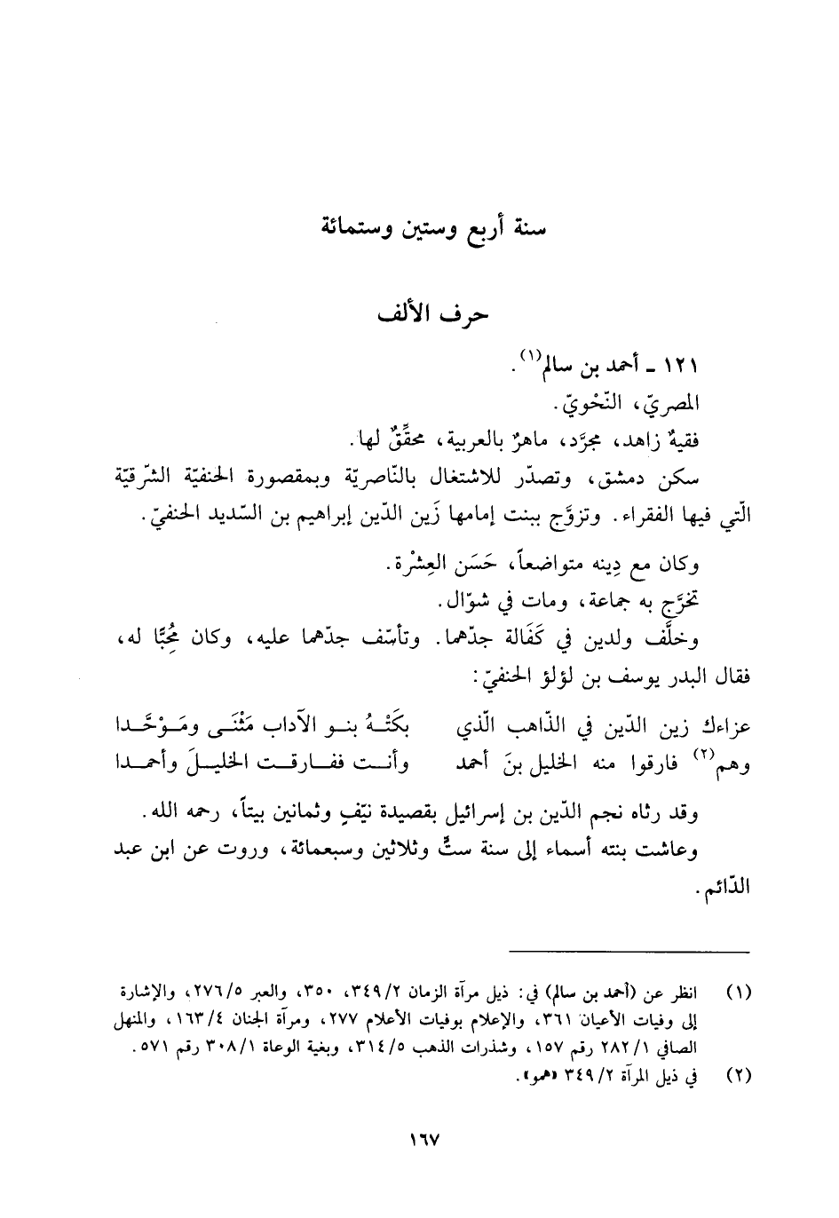 [1] انظر عن (أحمد بن سالم) في: ذيل مرآة الزمان 2/ 349، 350، والعبر 5/ 276، والإشارة إلى وفيات الأعيان 361، والإعلام بوفيات الأعلام 277، ومرآة الجنان 4/ 163، والمنهل الصافي 1/ 282 رقم 157، وشذرات الذهب 5/ 314، وبغية الوعاة 1/ 308 رقم 571.
